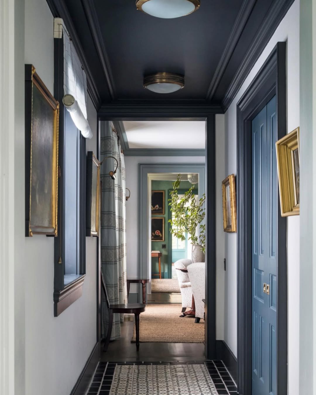 There’s something quietly dramatic about this narrow hallway. The deep blue trim and ceiling wrap the space in a cocoon, while those crisp white walls keep it from feeling closed in. It’s tailored, almost like a perfectly fitted coat.