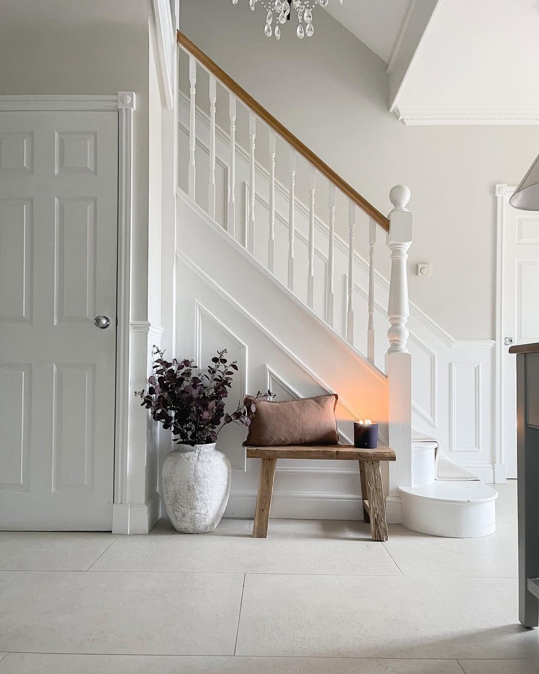 This corner feels like a breath of fresh air. Crisp white paneling, soft flooring, and a simple wooden bench create a space that feels open and grounded.