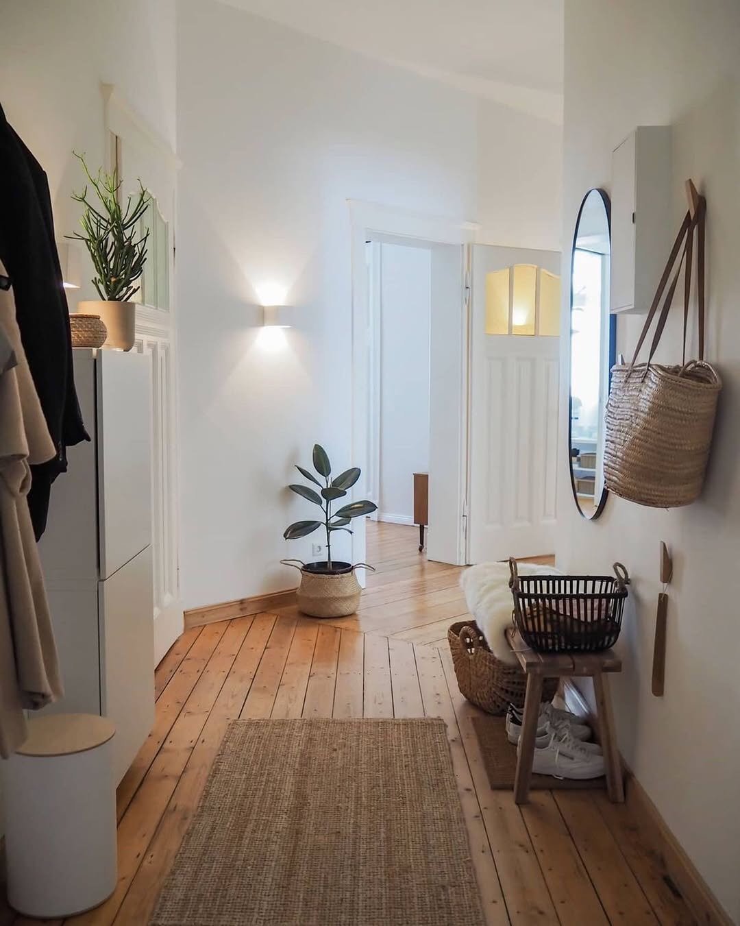 There’s a softness here that feels lived-in and thoughtful. Warm wood floors, woven textures, and a simple bench create a hallway that feels grounded and quietly styled.