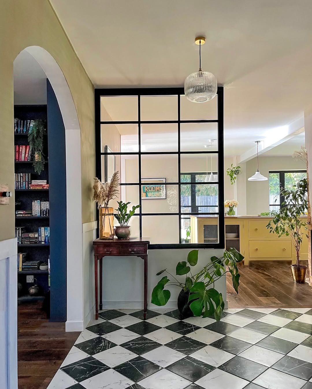 That archway draws you in instantly, softening the space before the bold grid partition takes over. It’s a clever mix of classic curves and modern structure, with plants weaving everything together.