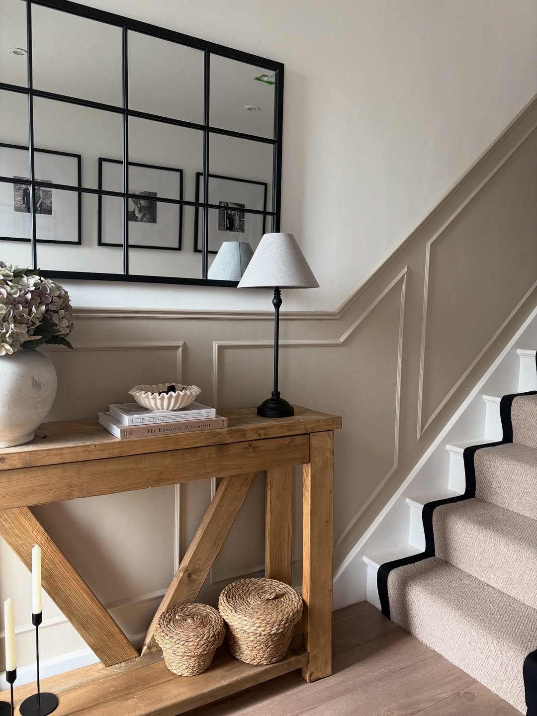 This corner is all about balance. Clean paneling meets warm wood, and that oversized grid mirror quietly doubles the space without stealing attention.