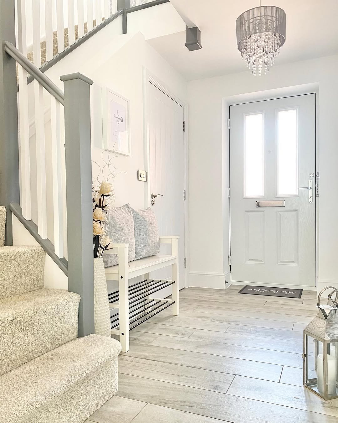 This space leans into calm in the most comforting way. Pale wood floors, soft grey accents, and a simple bench create a hallway that feels clean without feeling empty.