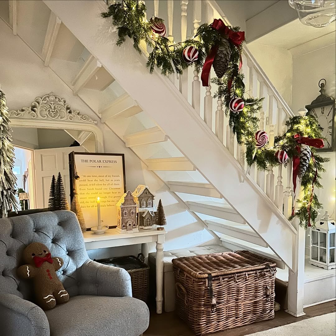 This corner feels like it belongs in a childhood memory. Garland, soft lighting, and those little festive details turn the staircase into something almost magical.