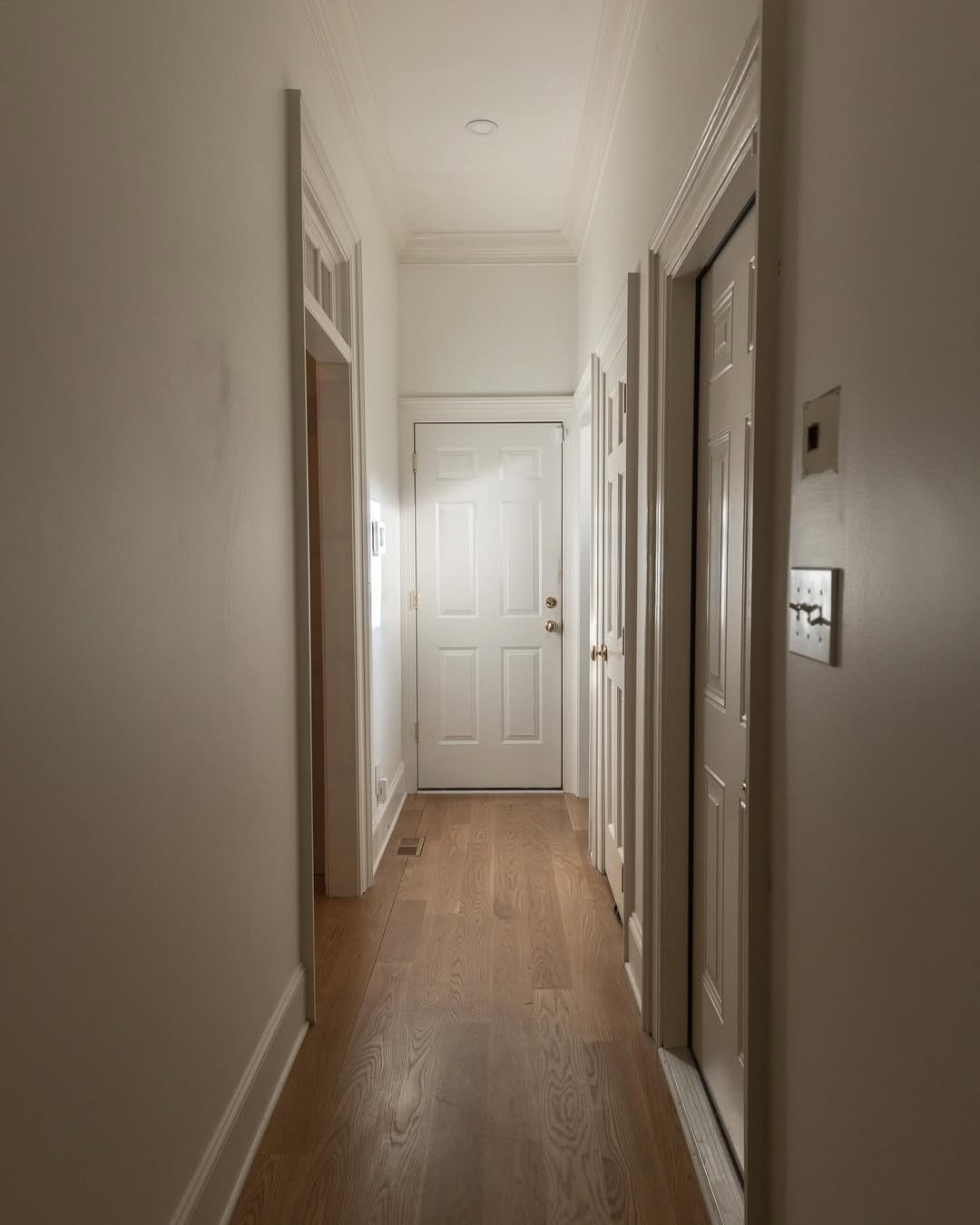 It creates a sense of quiet continuity, especially in a narrow hallway. The paint almost disappears, which is exactly the point, it gives the space room to breathe.