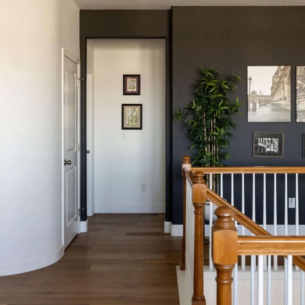 This hallway leans into drama, but in a grounded, livable way. A deep charcoal wall anchors the space, letting the lighter walls and warm wood tones breathe around it.