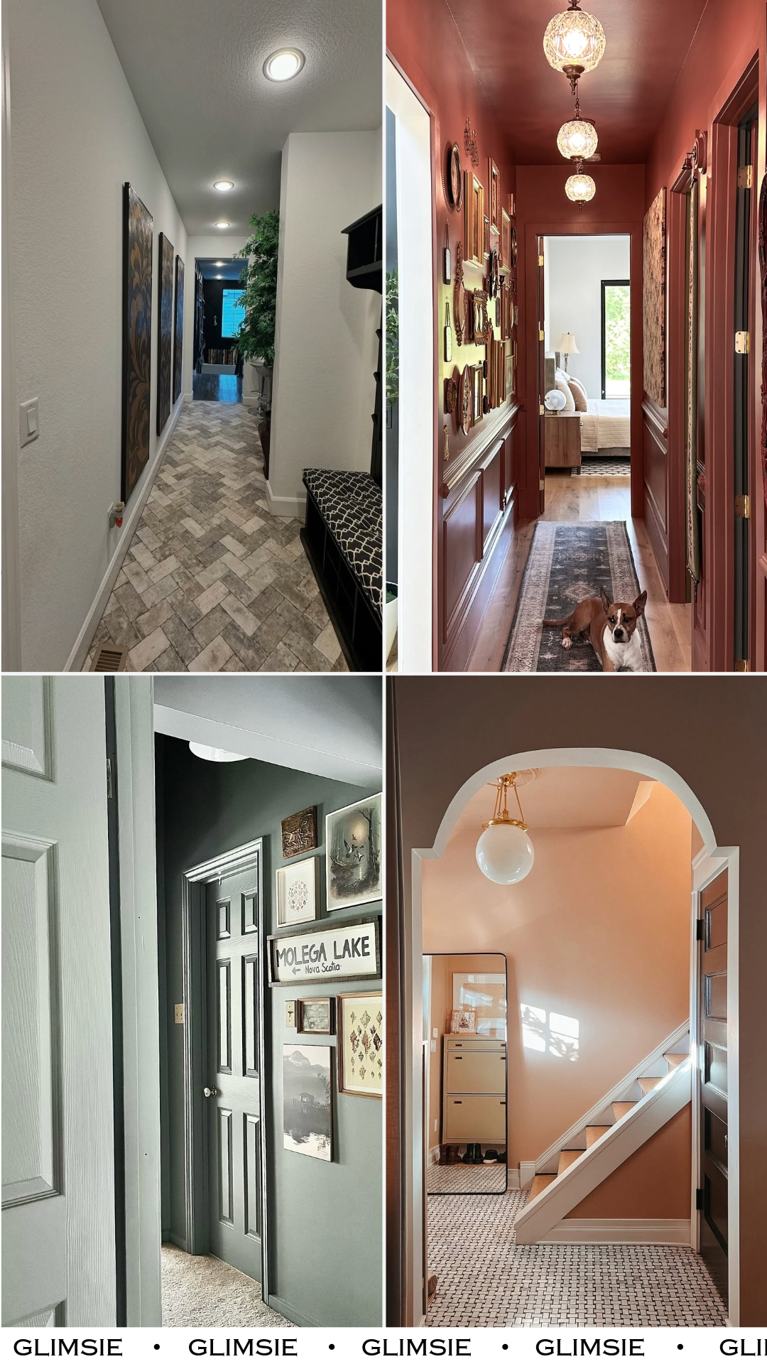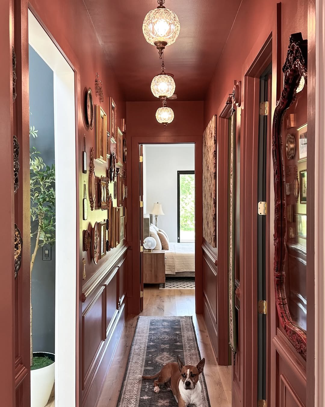 This one doesn’t whisper, it speaks. A rich, saturated red wraps the hallway in warmth, turning it into a moment rather than just a pass-through.