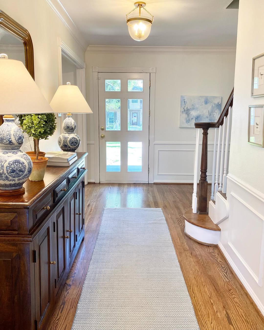 A pale gray like this brings just enough contrast without shifting too cool. It sits comfortably between white and deeper tones, giving the hallway a clean, tailored look.
