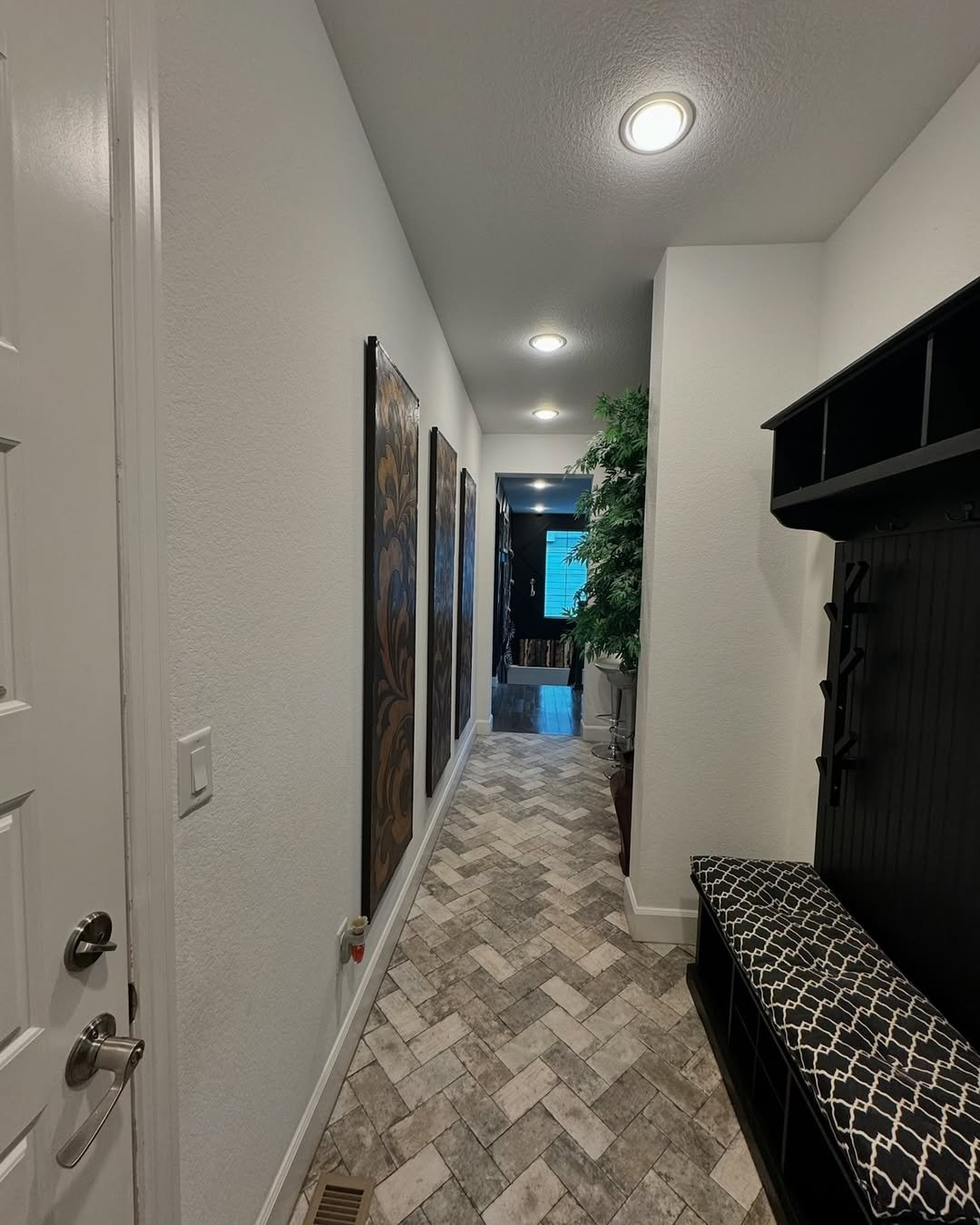 This hallway leans into contrast in the most effortless way. Crisp white walls stretch the space visually, while darker accents in the artwork and bench add just enough weight to keep things grounded. It feels sharp, modern, and quietly confident.