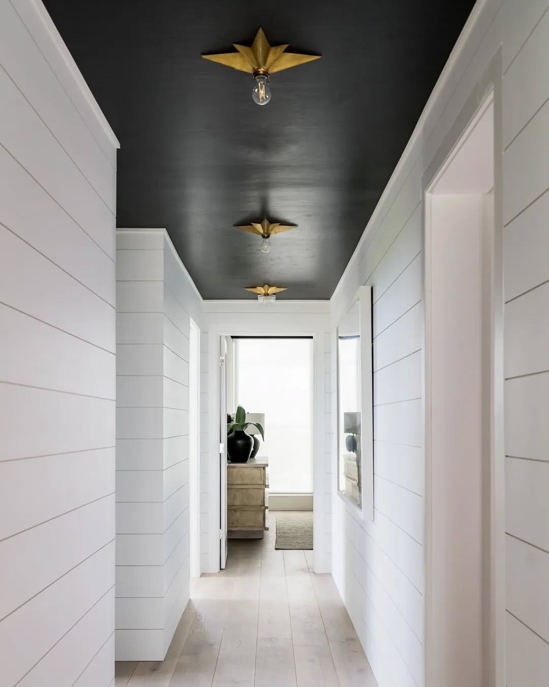 Here’s where things get interesting. Crisp white walls keep the hallway light, but that deep, inky ceiling flips the entire mood.