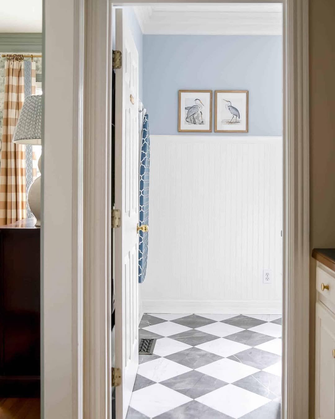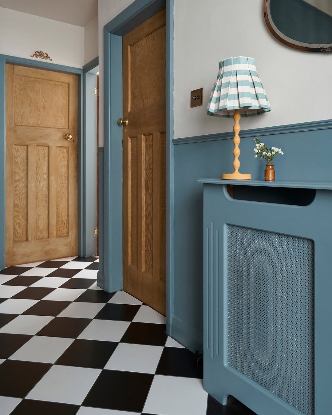It plays beautifully with the checkerboard floor and warm wood doors. Nothing feels overly styled, just layered, like pieces gathered over time and painted into harmony.