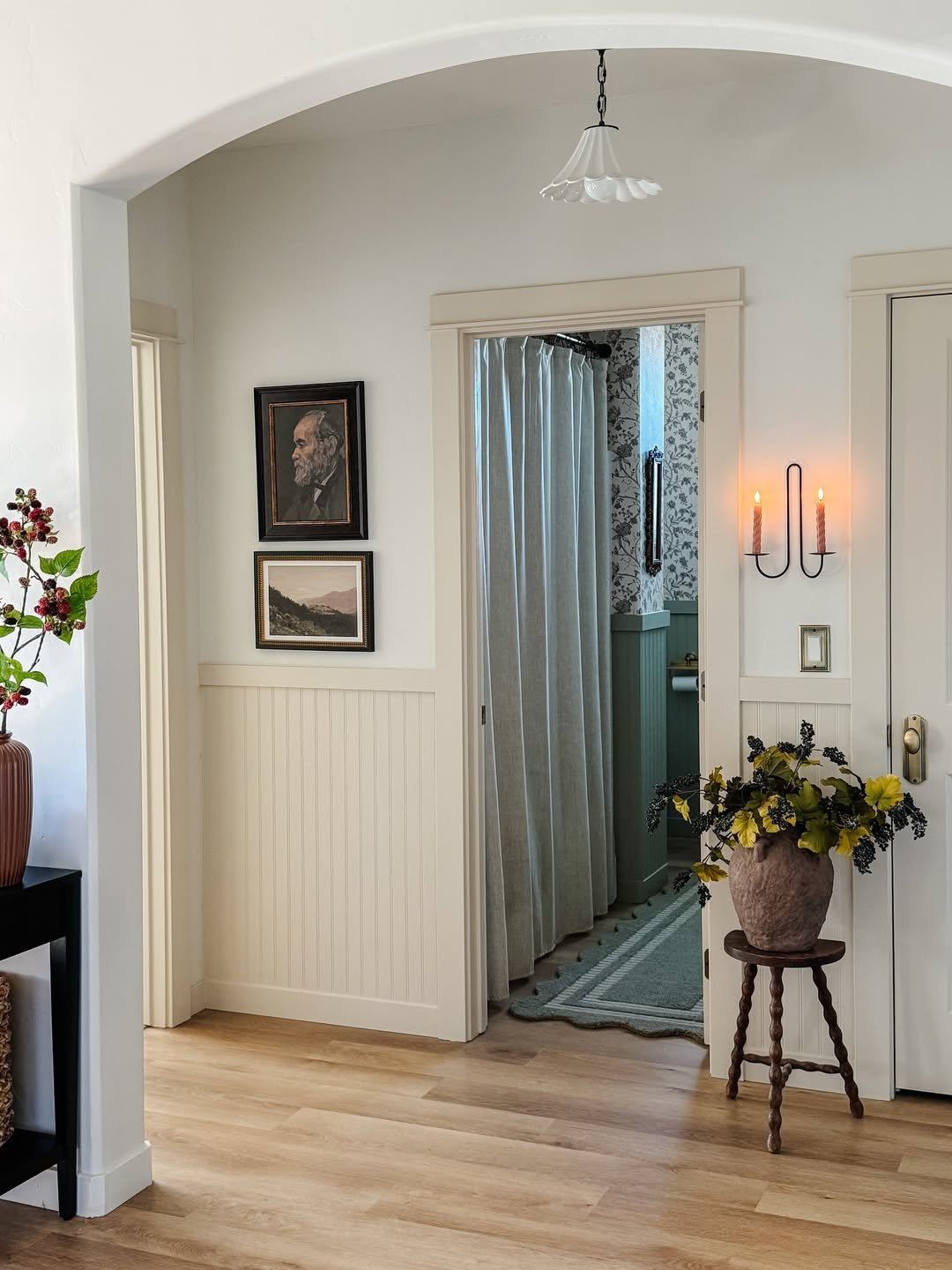 This hallway feels soft in all the right ways. A creamy paint tone blends seamlessly with the wood flooring and subtle trim, creating a look that feels collected rather than designed.