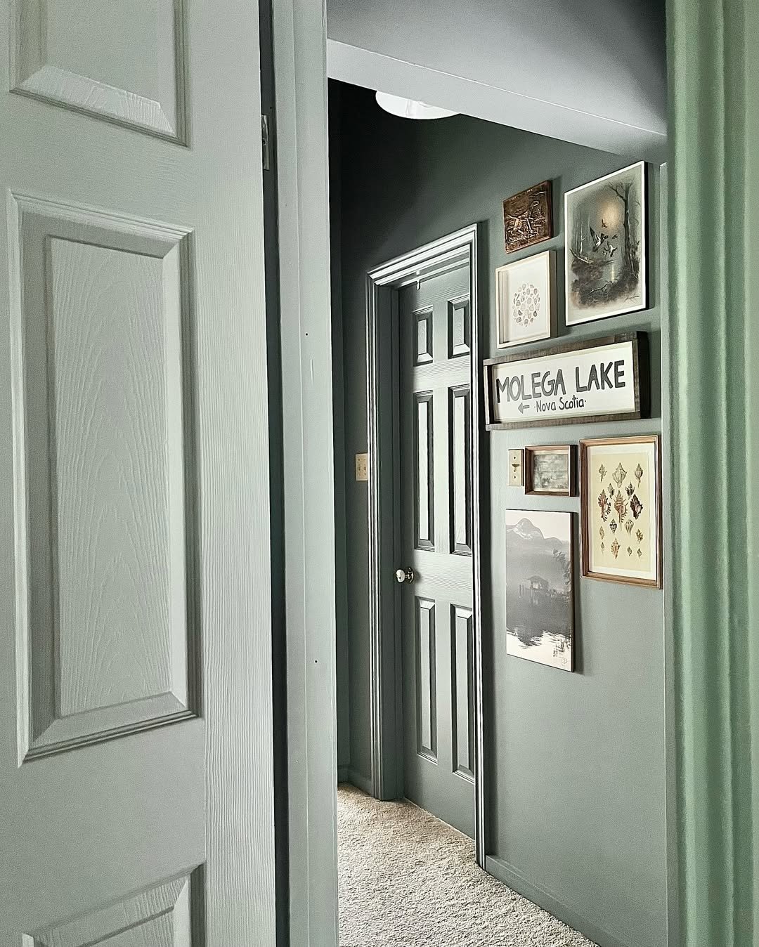This hallway feels like a quiet little gallery. A muted green backdrop sets the stage for layered artwork, giving everything a sense of calm cohesion.