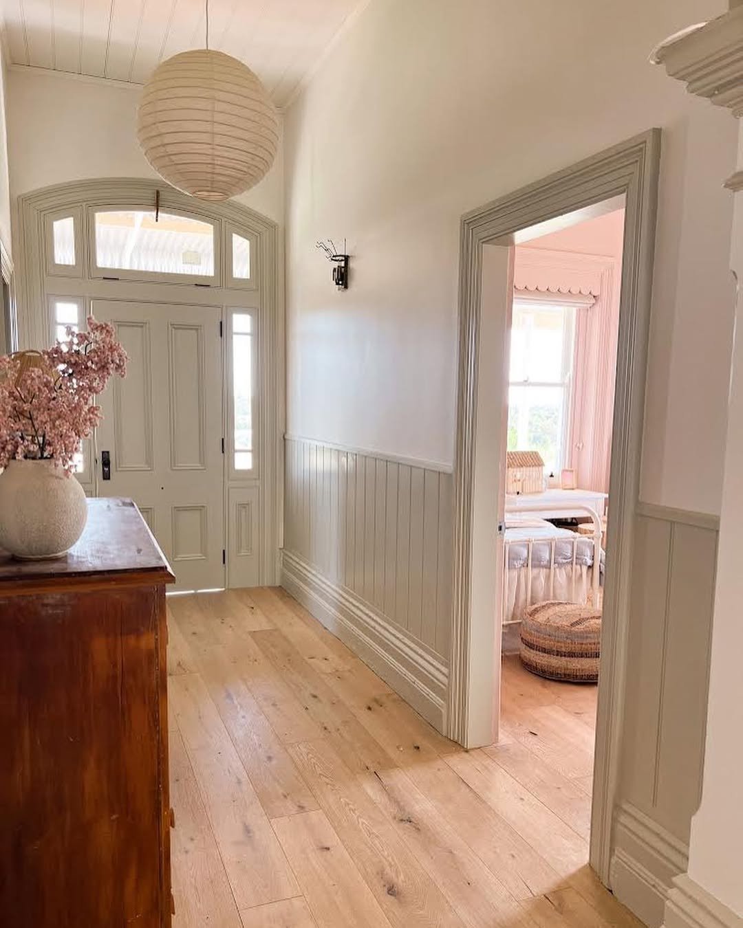 This hallway leans into softness with a warm neutral that almost glows. It’s the kind of shade that makes everything, from florals to vintage frames, feel a little richer.