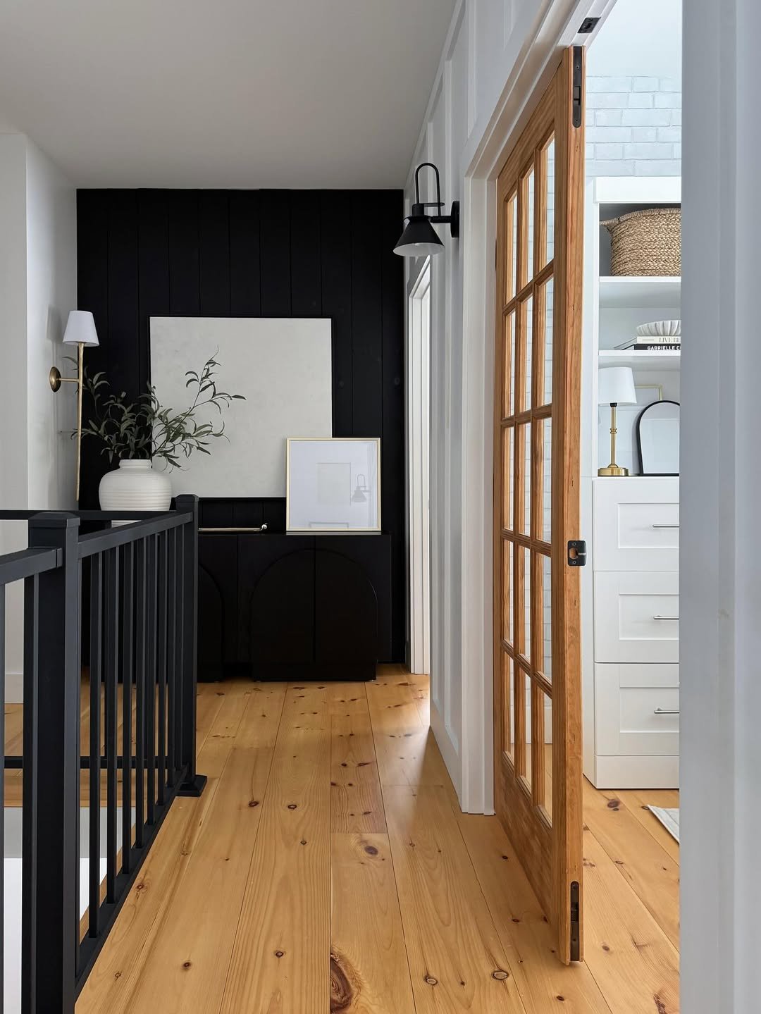 There’s something about this pairing that just clicks. Soft white walls keep the hallway open and easy, while those inky black doors and trim add structure, like a perfectly tailored blazer over something relaxed.