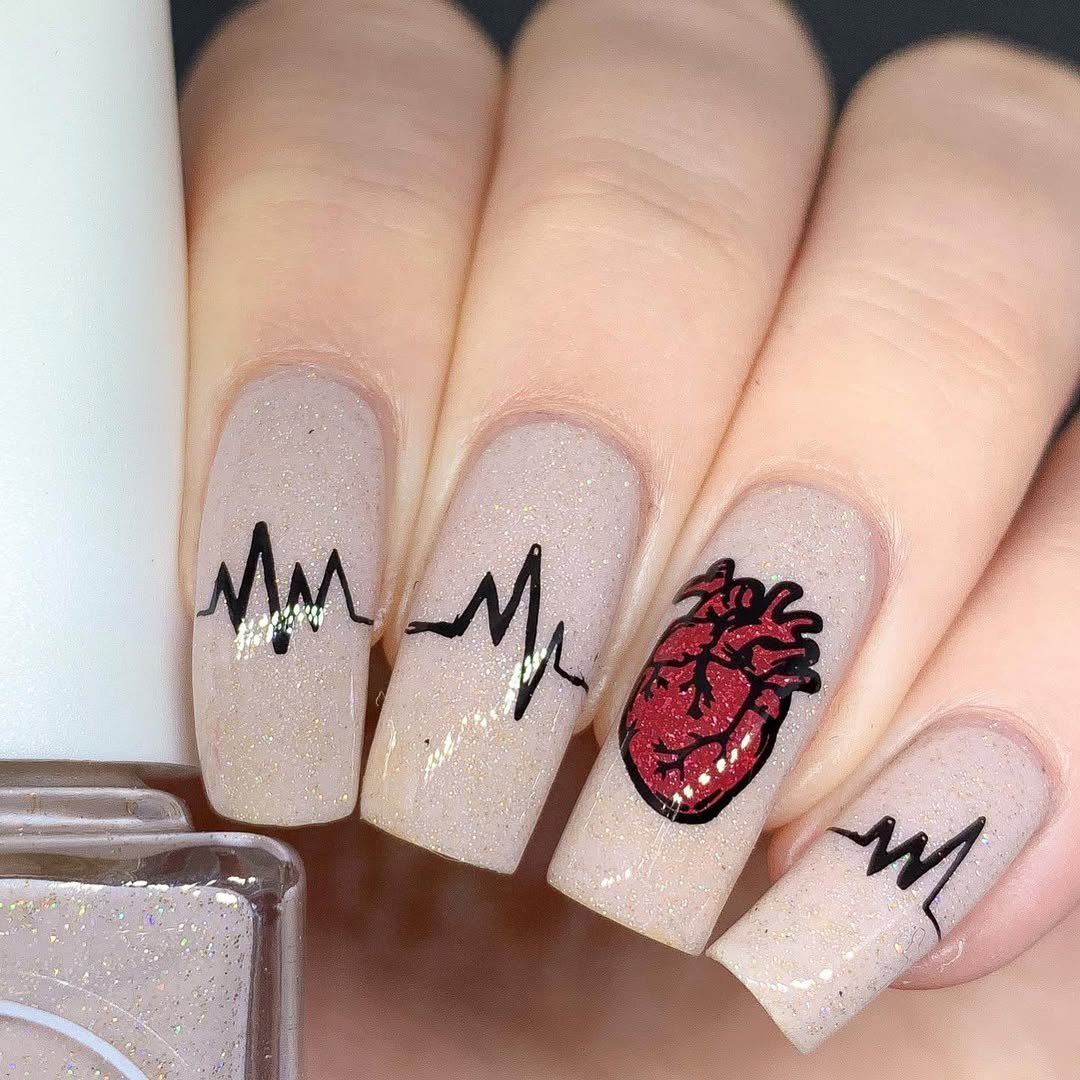 A little edgy, a little artistic — this heartbeat design is for the girl who loves something unexpected. The delicate EKG lines paired with a vivid anatomical heart create a bold contrast against a soft, shimmery nude background.