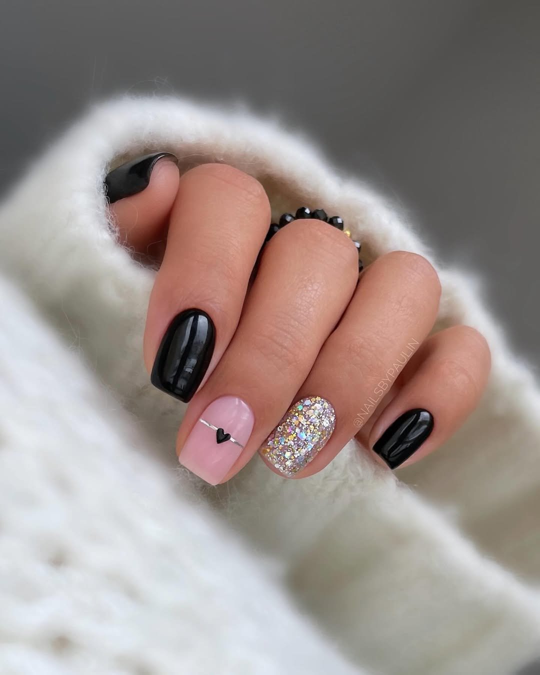 This mani is such a pretty balance of soft and bold — glossy jet-black nails paired with a blush-pink accent topped with a tiny heart. And the glitter nail? It feels like a little burst of celebration tucked into an otherwise sleek palette.