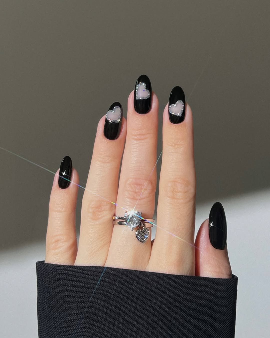 Black polish gets a soft, dreamy upgrade with translucent heart cutouts edged in delicate sparkle. The contrast is striking in the most chic way — a little mysterious, a little starry-eyed.
