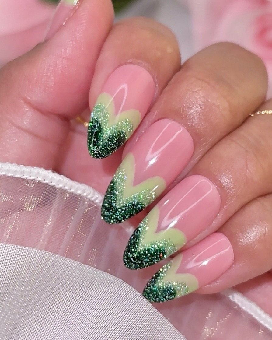 This design brings a fresh spin on the classic heart-shaped tip — a soft green outline flowing into rich, shimmery emerald. The gradient is dreamy, almost velvety, and the pink base keeps everything grounded and feminine.