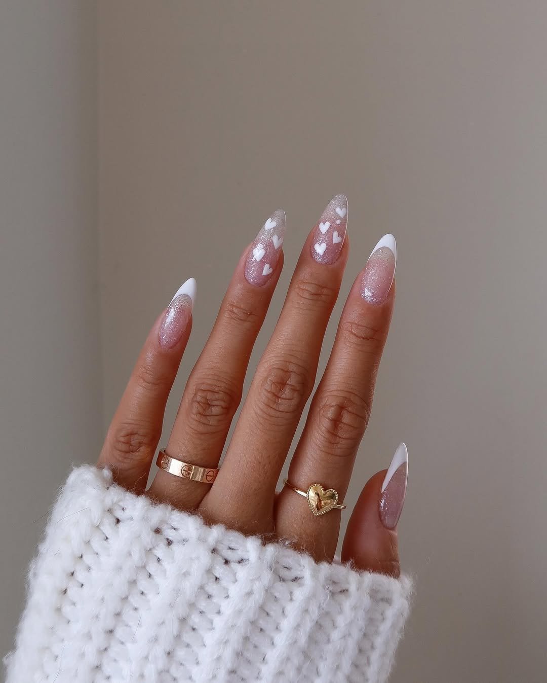 Shimmery white tips blend into sparkling bases dotted with little white hearts, creating a soft, snow-kissed effect. Everything feels light and magical, like frost settling onto a windowpane.