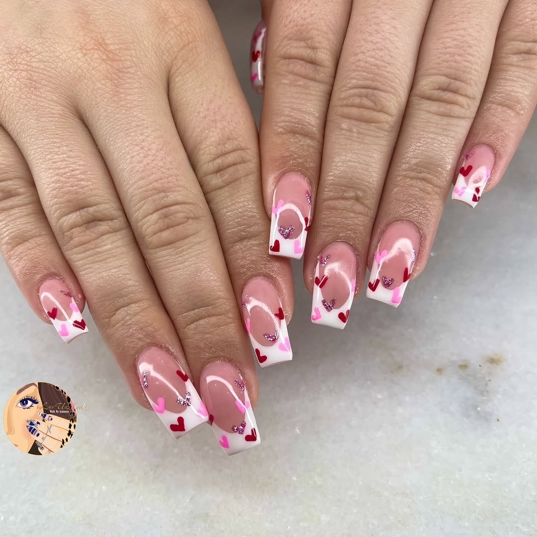 A playful twist on a classic French — bright white tips with swirling pinks, scattered red hearts, and a touch of sparkle. It’s youthful and fun without losing that polished finish.