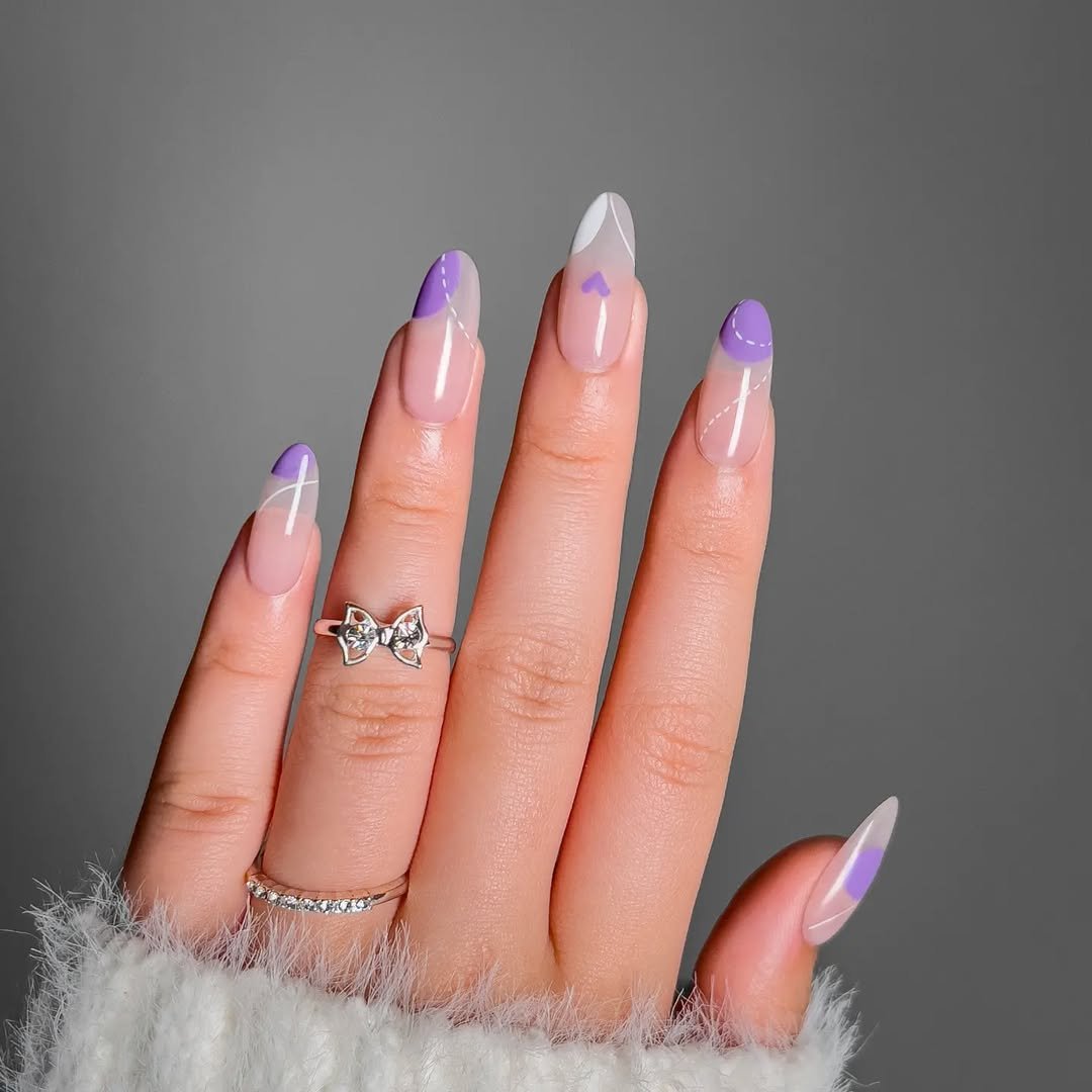 Delicate lavender strokes sweep across a nude base, giving you a mani that feels airy and almost dreamlike. The tiny purple heart tucked into one nail seals the look with a gentle sweetness.