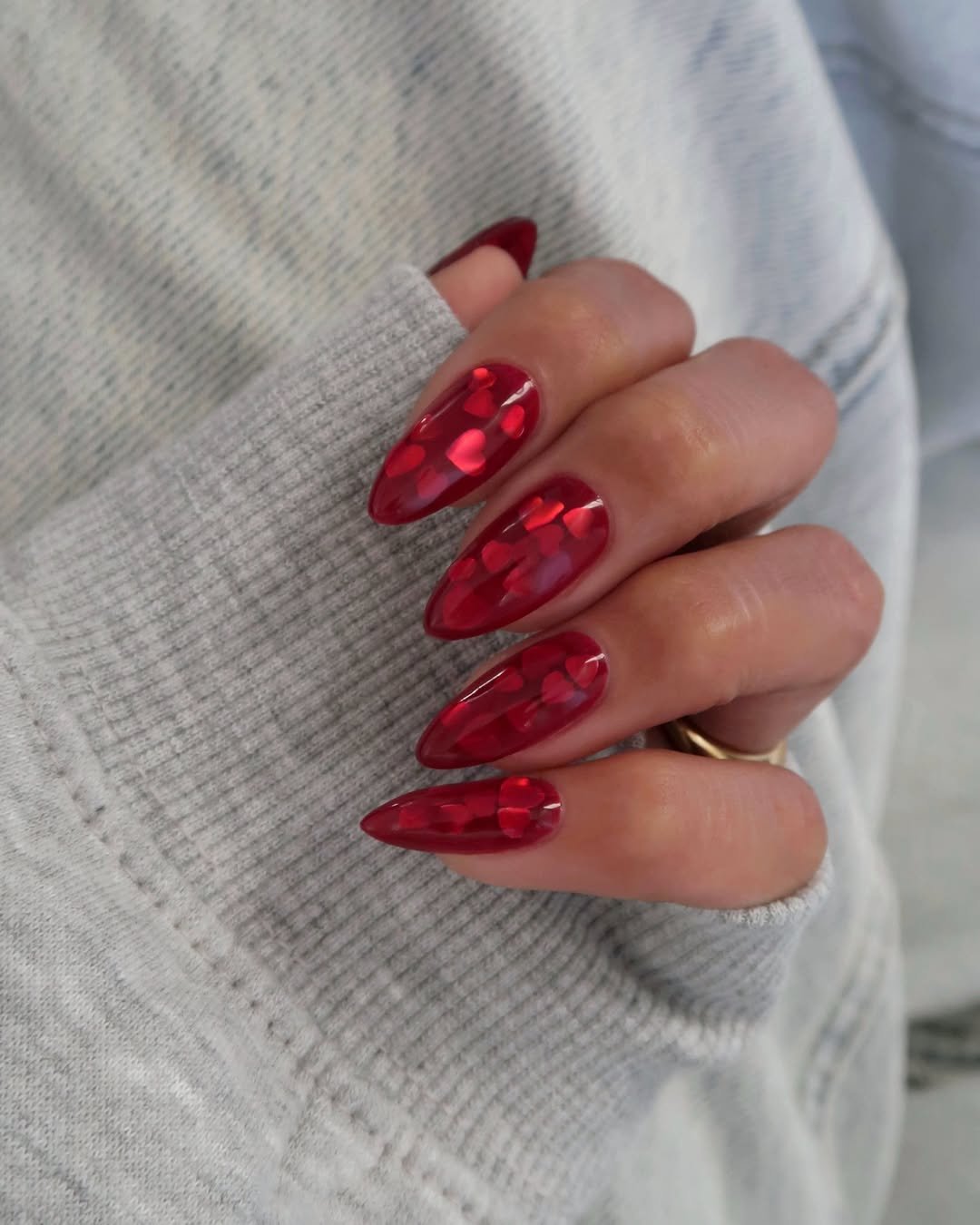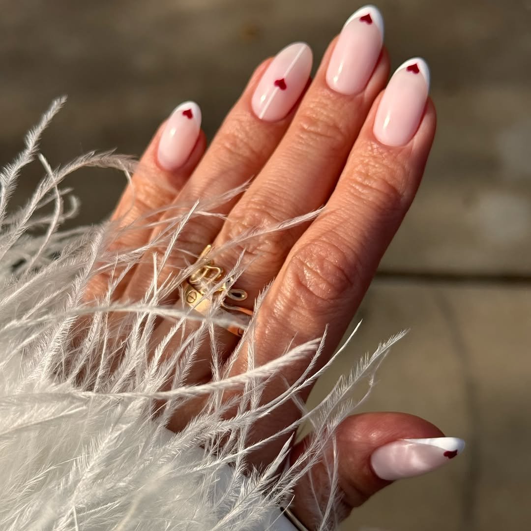 A milky nude base dotted with tiny red glitter hearts makes this mani feel sweet and effortless. The placement looks natural, almost like little confetti moments scattered across each nail.
