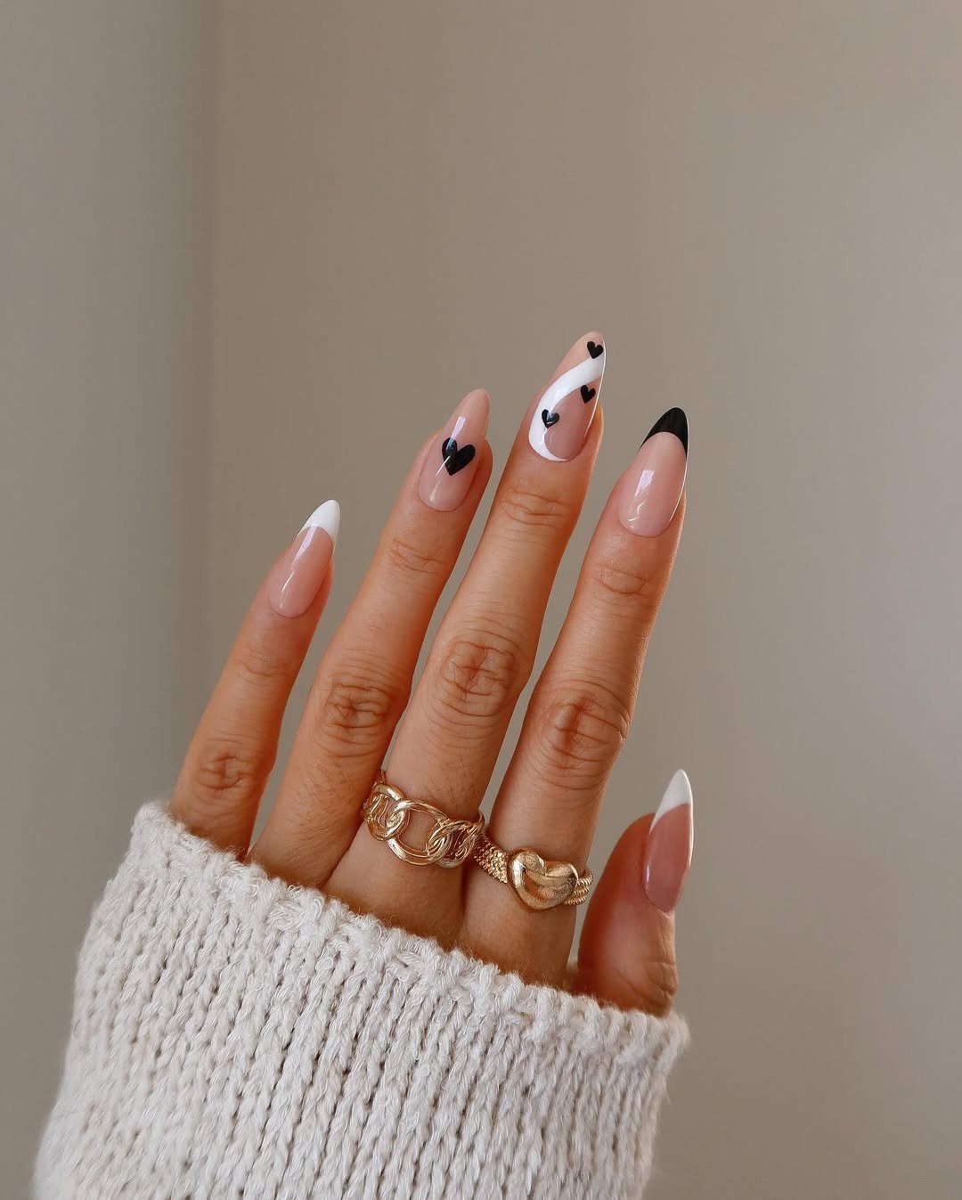 Clean white and inky black come together in the most chic way — crisp French tips on some nails, contrasted by dainty black hearts on others. It’s minimal but never boring, with a modern edge that stands out effortlessly.