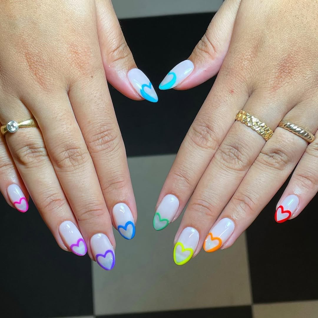 These colorful heart outlines are pure joy — each tip decorated with a different bright shade, all floating on a milky-sheer base that keeps things soft and wearable.