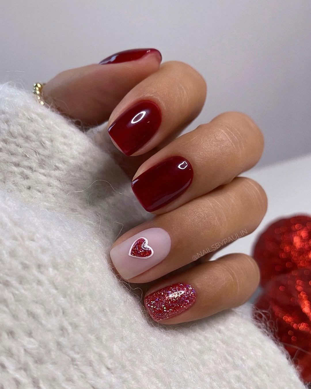 Classic red meets glittery sweetness in this cozy, winter-ready mani. The ruby sparkle heart framed in white feels like a tiny charm — one that instantly warms up the entire look.