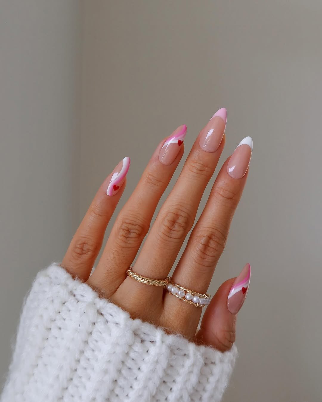 These airy swirls of pink and white glide across a glossy neutral base, with tiny red hearts tucked right into the curves. It feels light, feminine, and just dreamy enough to make every gesture a little sweeter.