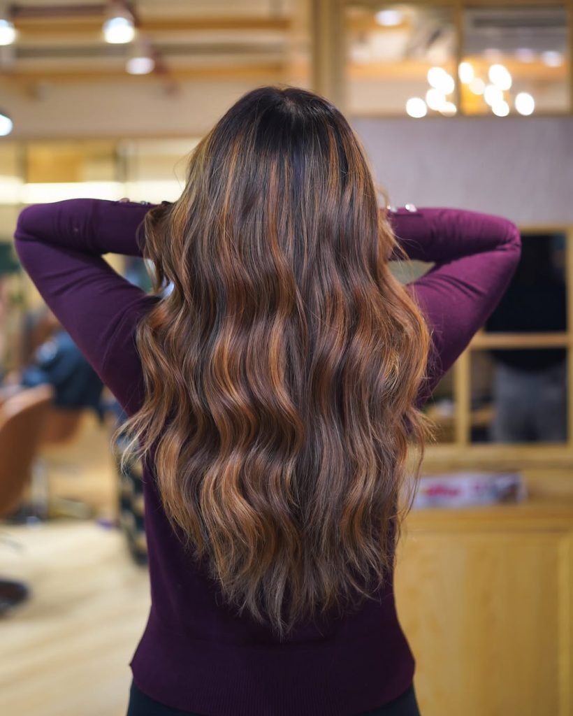 This look is all about low-key luxe. The base is a deep mocha brown, rich and grounding, while the soft toffee highlights thread through like sunbeams, adding just the right touch of warmth. The waves are intentionally undone—airy and effortless—giving the whole style a modern, lived-in polish.