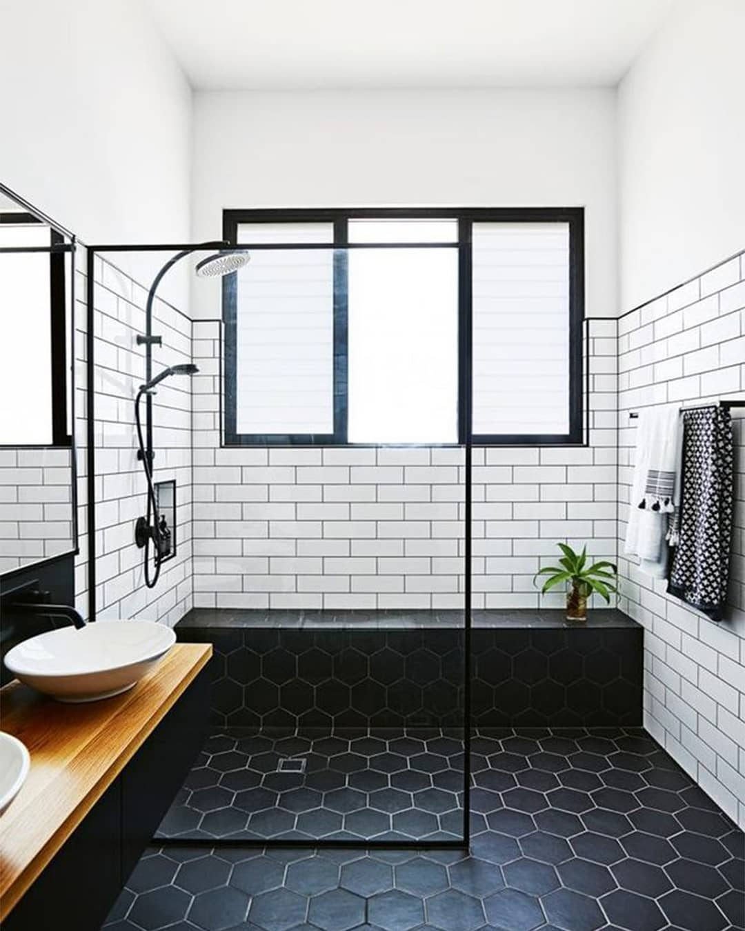Clean, bold, and super satisfying. The crisp white subway tiles against that matte black floor and fixtures? Instant hotel energy.