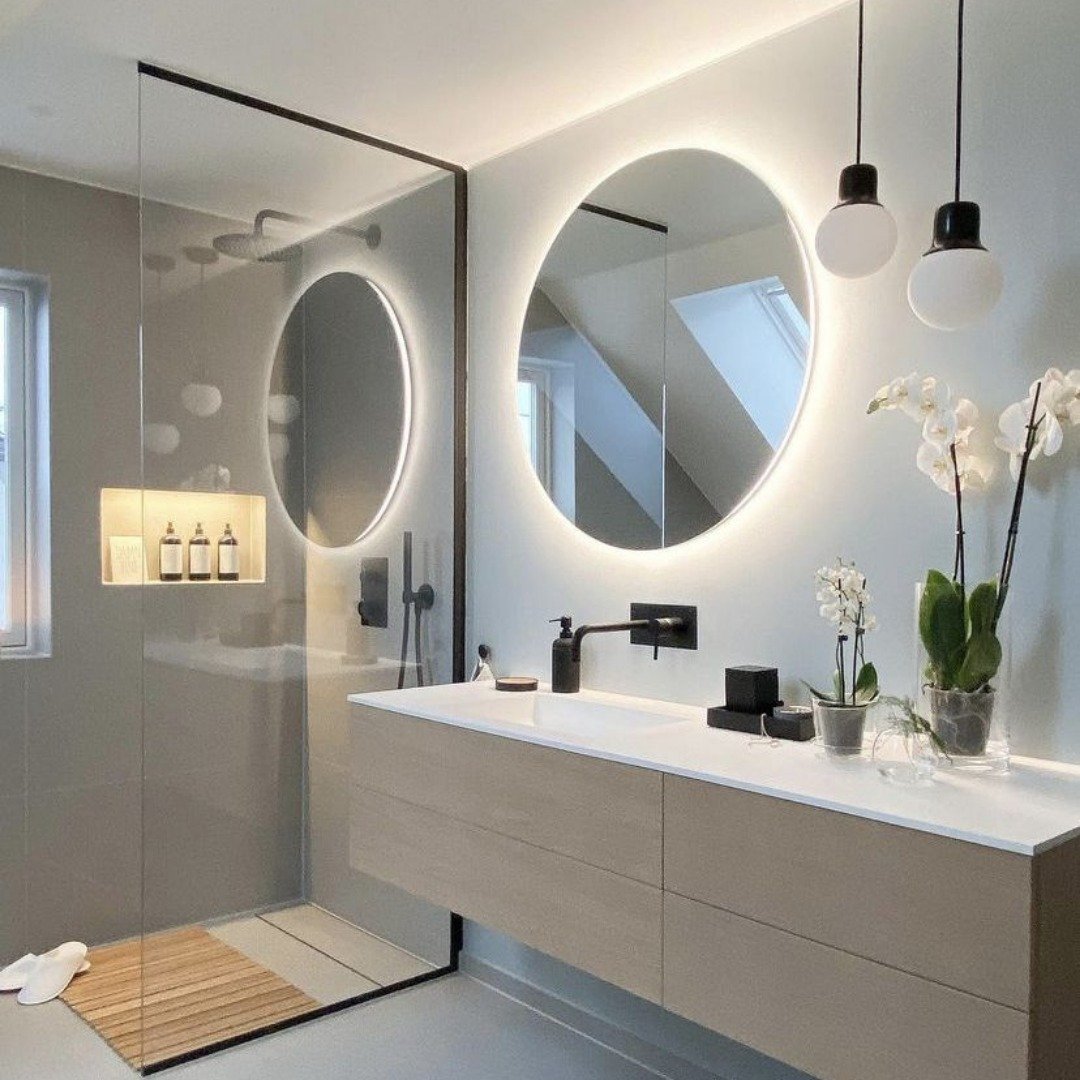 This one keeps it super minimal but still hits. The soft backlit mirror and neutral tones make everything feel calm and grounded.
