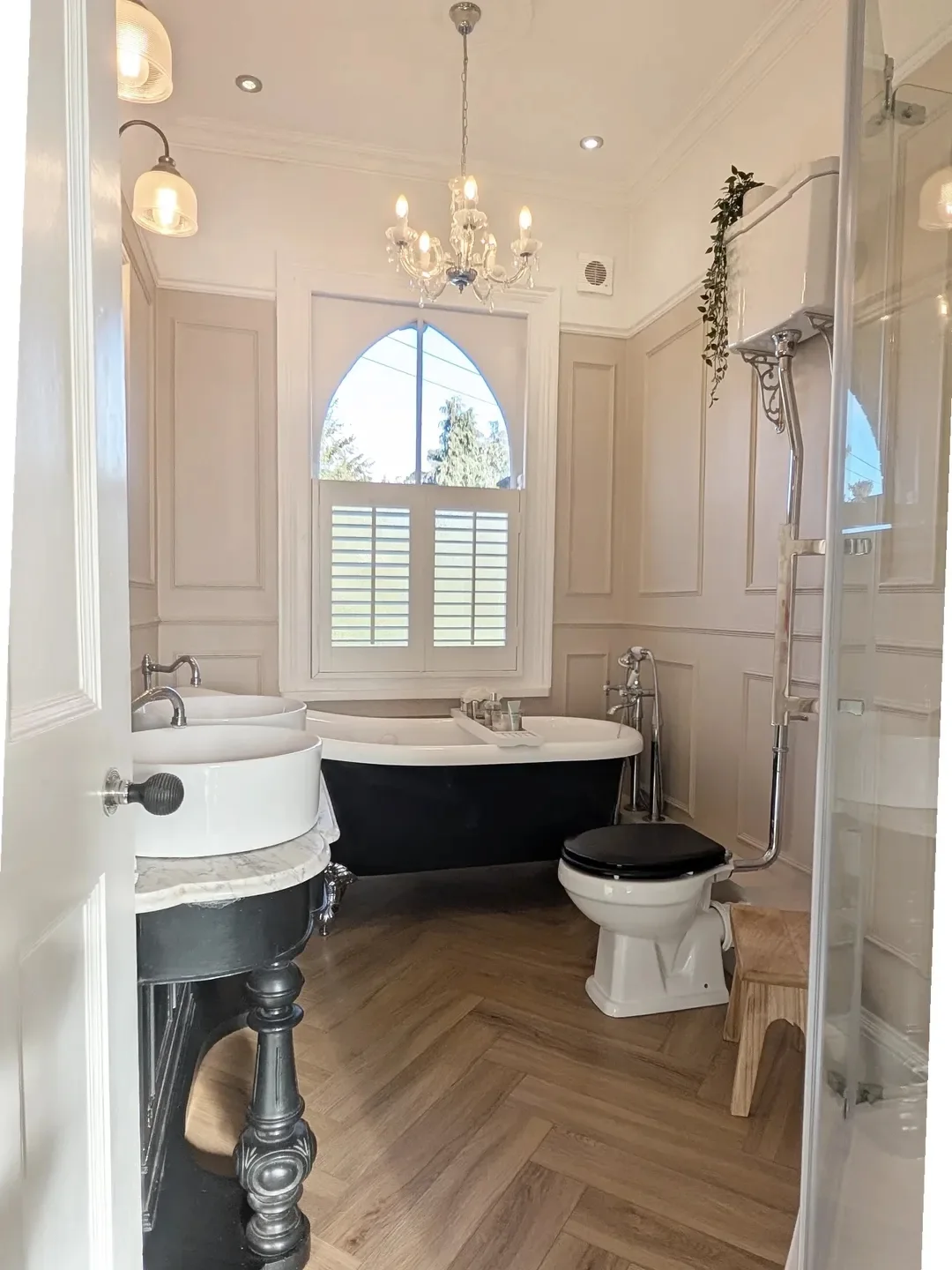 This one has serious old-school charm. The panelled walls, chandelier, and freestanding tub give it that timeless elegance.