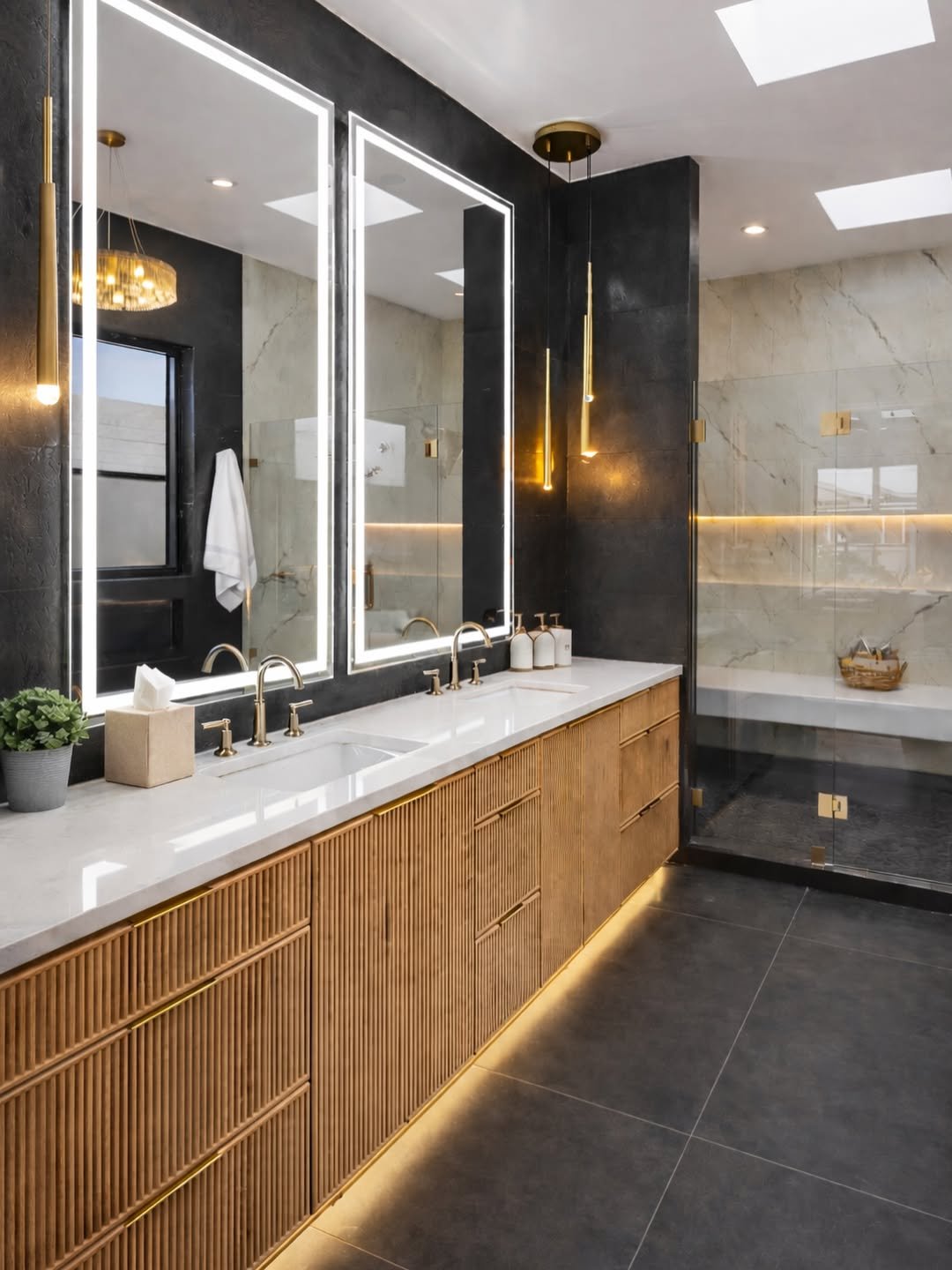 Now this is statement luxury. The dark walls, gold accents, and those glowing mirrors? It’s giving high-end hotel suite energy.