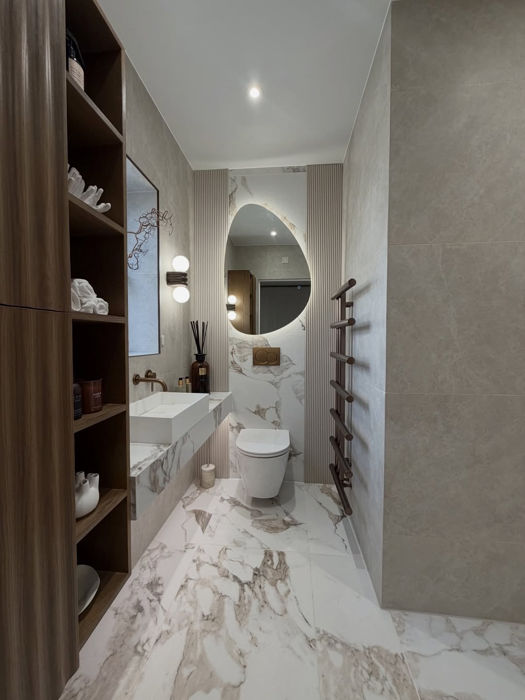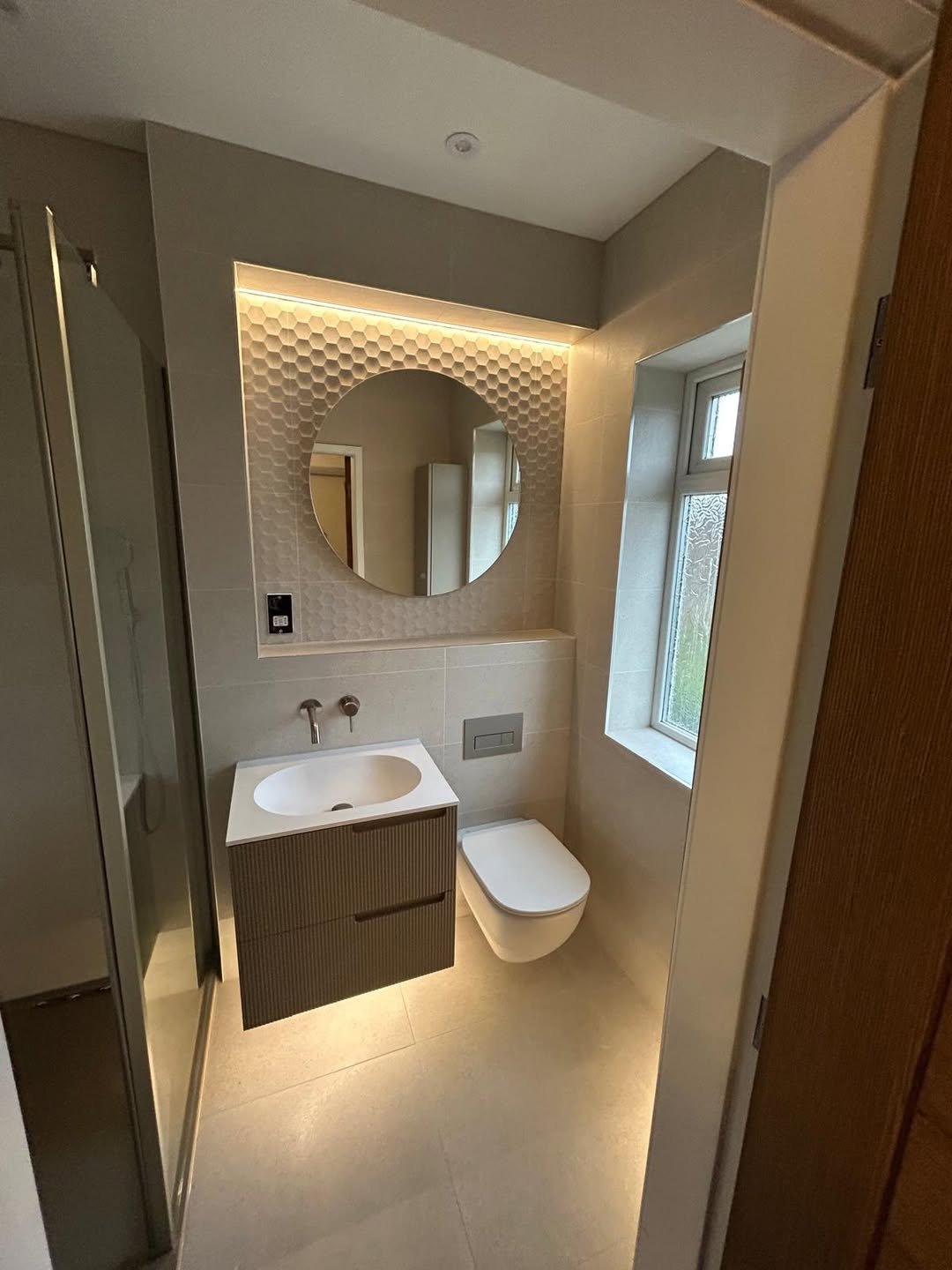 Small space, big mood. That backlit niche and rounded mirror create such a soft, warm glow—it’s giving boutique hotel powder room.