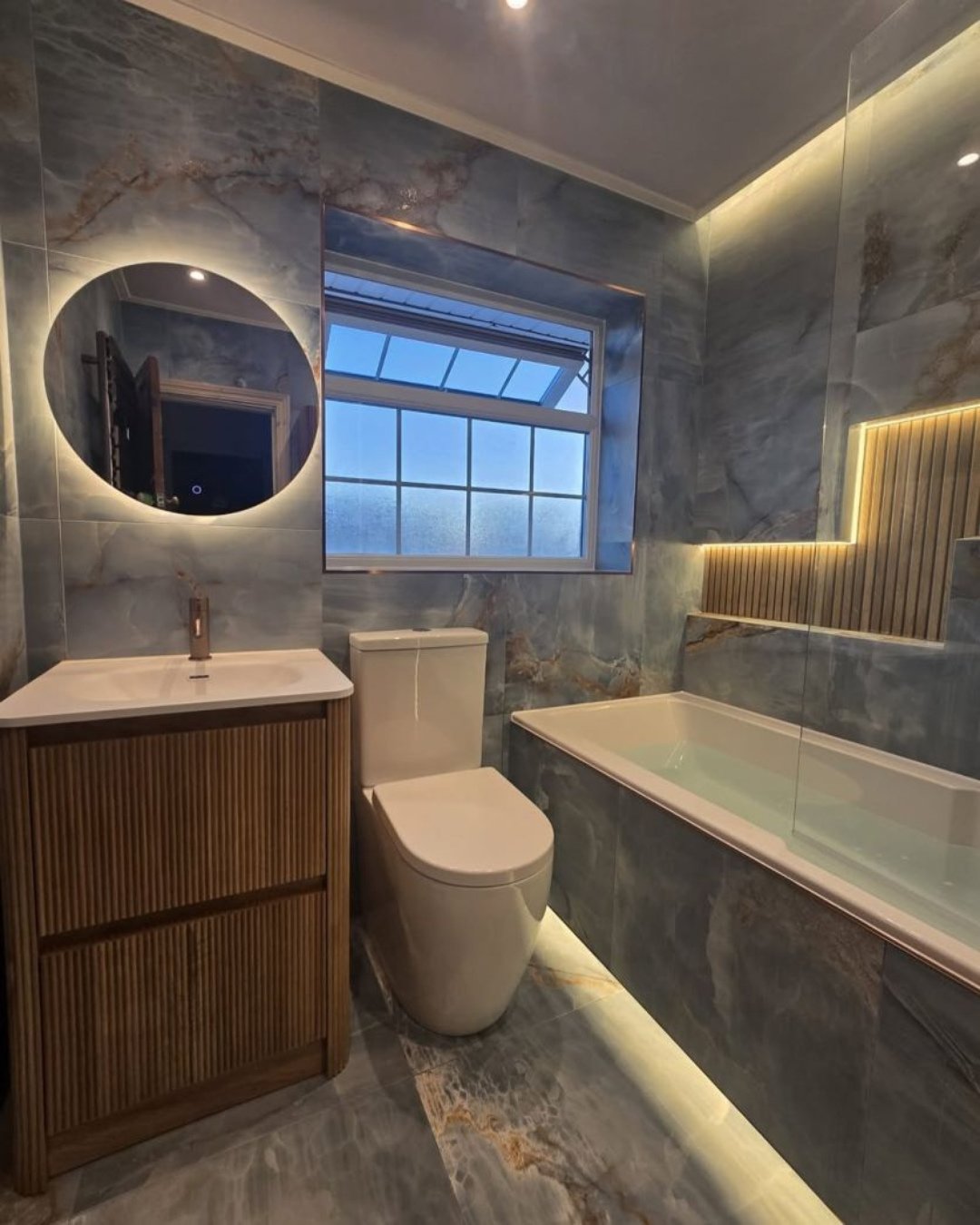 This one feels like stepping into a high-end hotel suite at night. The deep marble tones paired with that soft LED glow create this cozy, almost cinematic vibe.