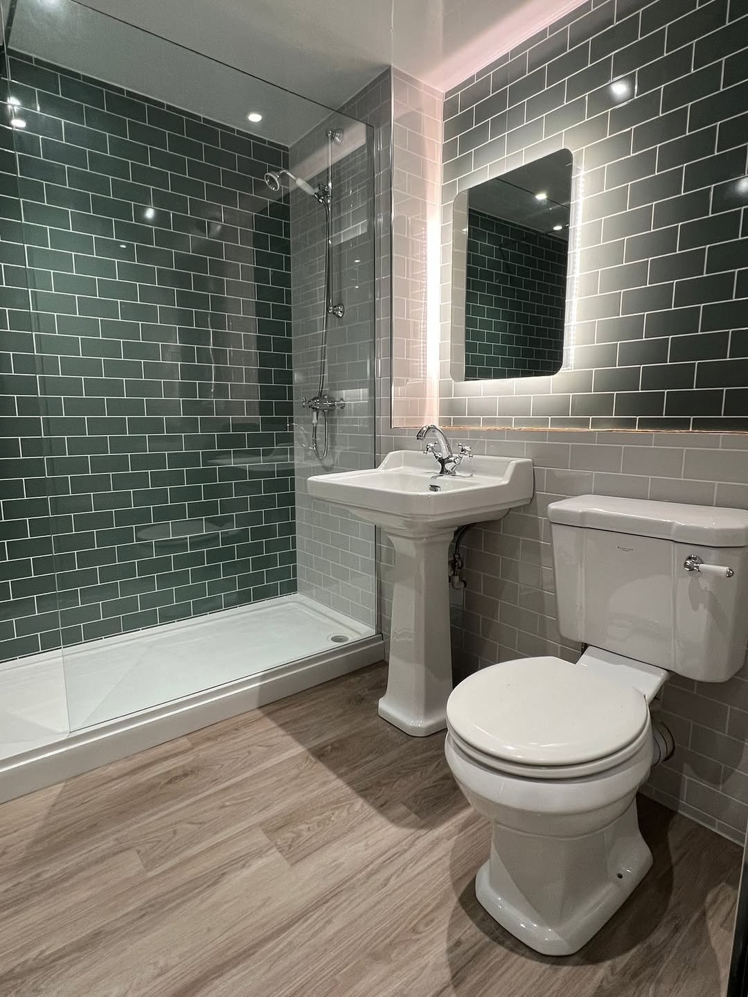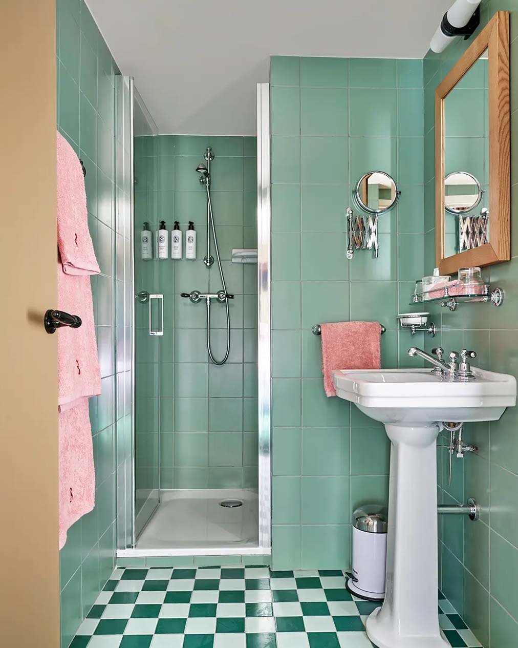 This one has personality—and it works. The green tiles with those soft pink accents feel playful but still styled like a curated hotel space.