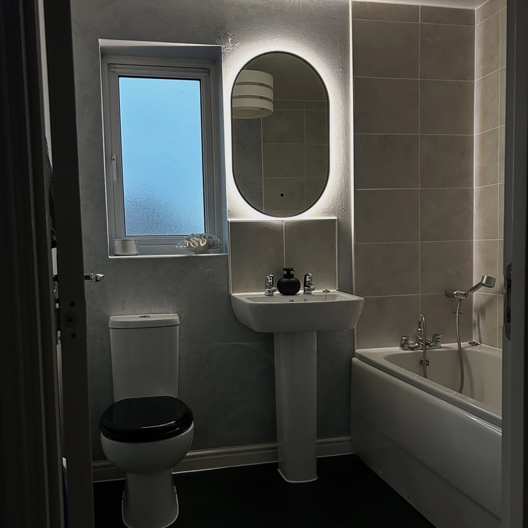 That backlit round mirror? Immediate hotel vibes. It adds this soft glow that makes the whole space feel elevated without doing too much.