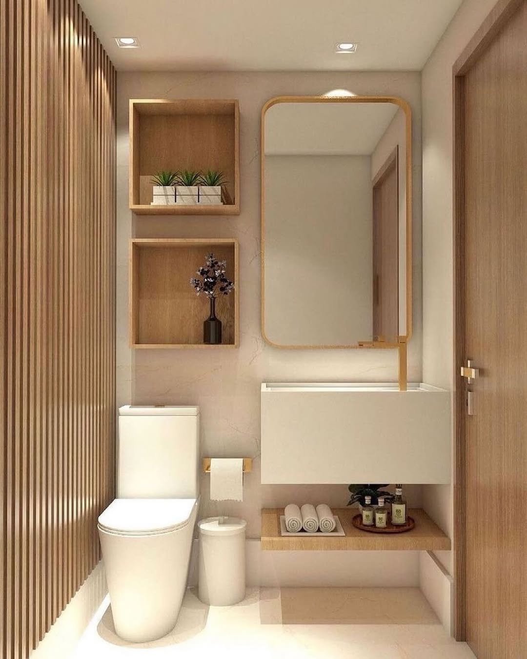 The mix of warm wood with soft lighting here is honestly so satisfying. Those built-in shelves and the glowing mirror add just enough depth without making it busy.
