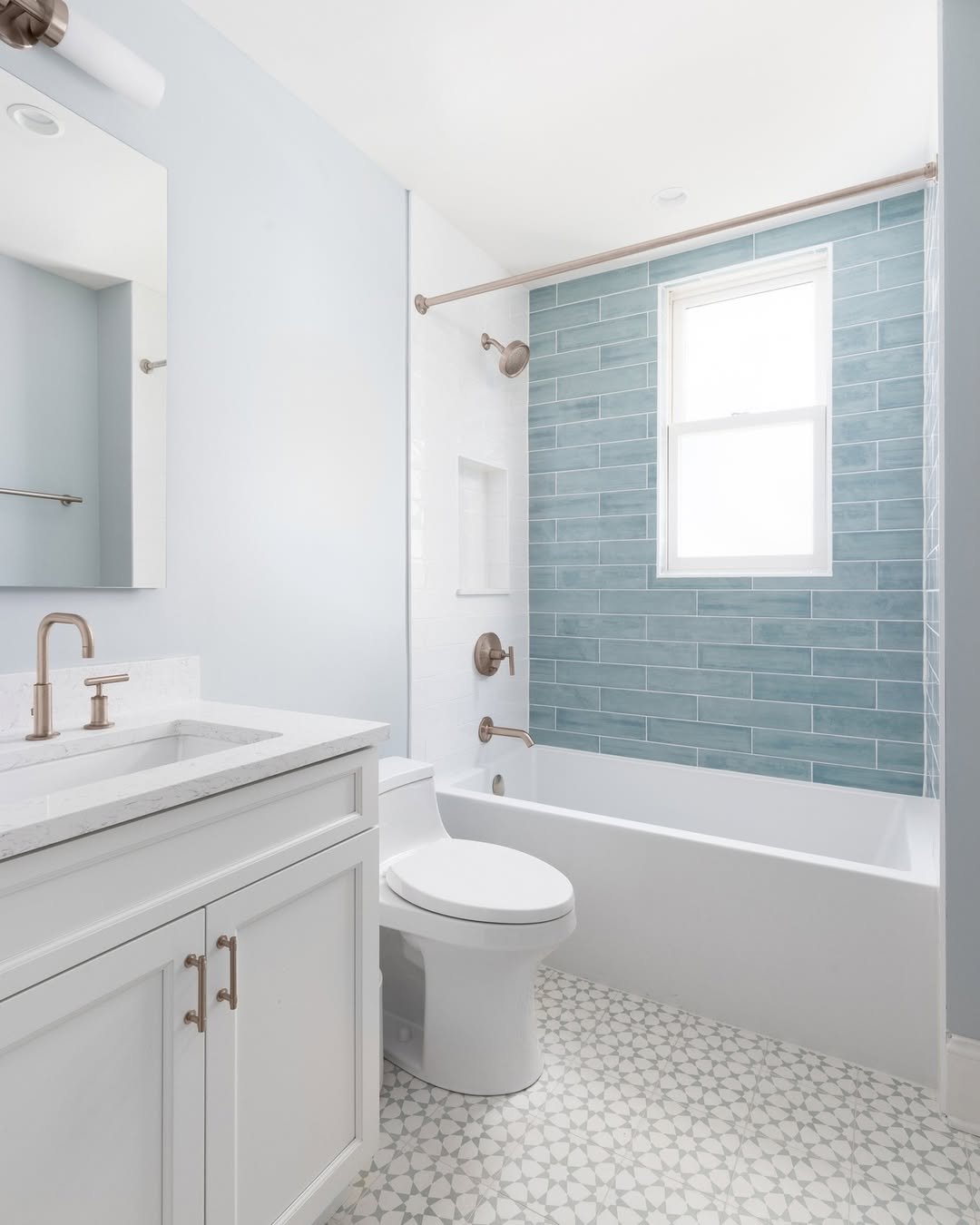 Light blue tiles instantly make this feel airy and fresh. Paired with white cabinetry, it gives that clean, coastal hotel vibe.