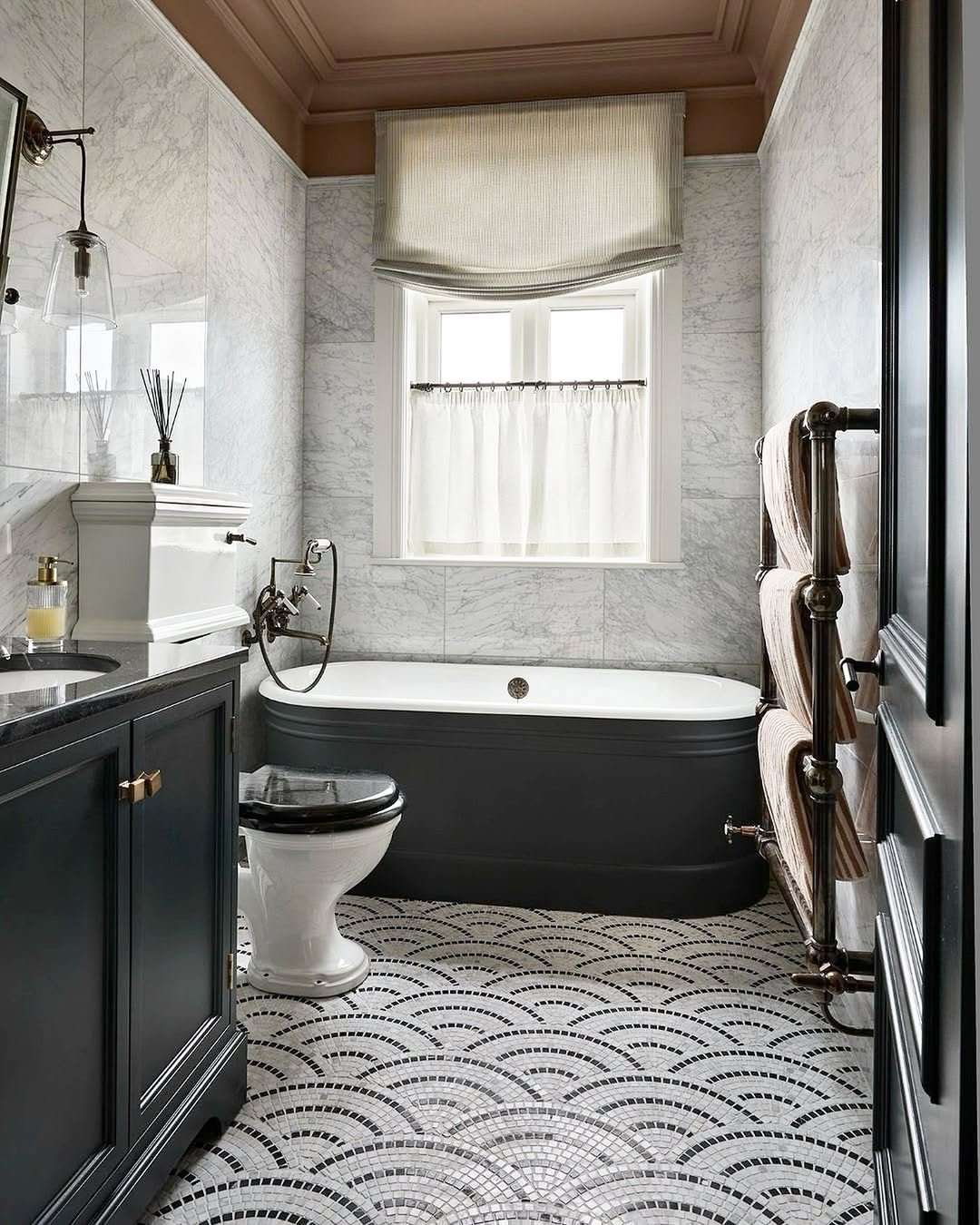 There’s something so satisfying about this one. That patterned floor pulls you in, while the classic fixtures keep everything grounded.