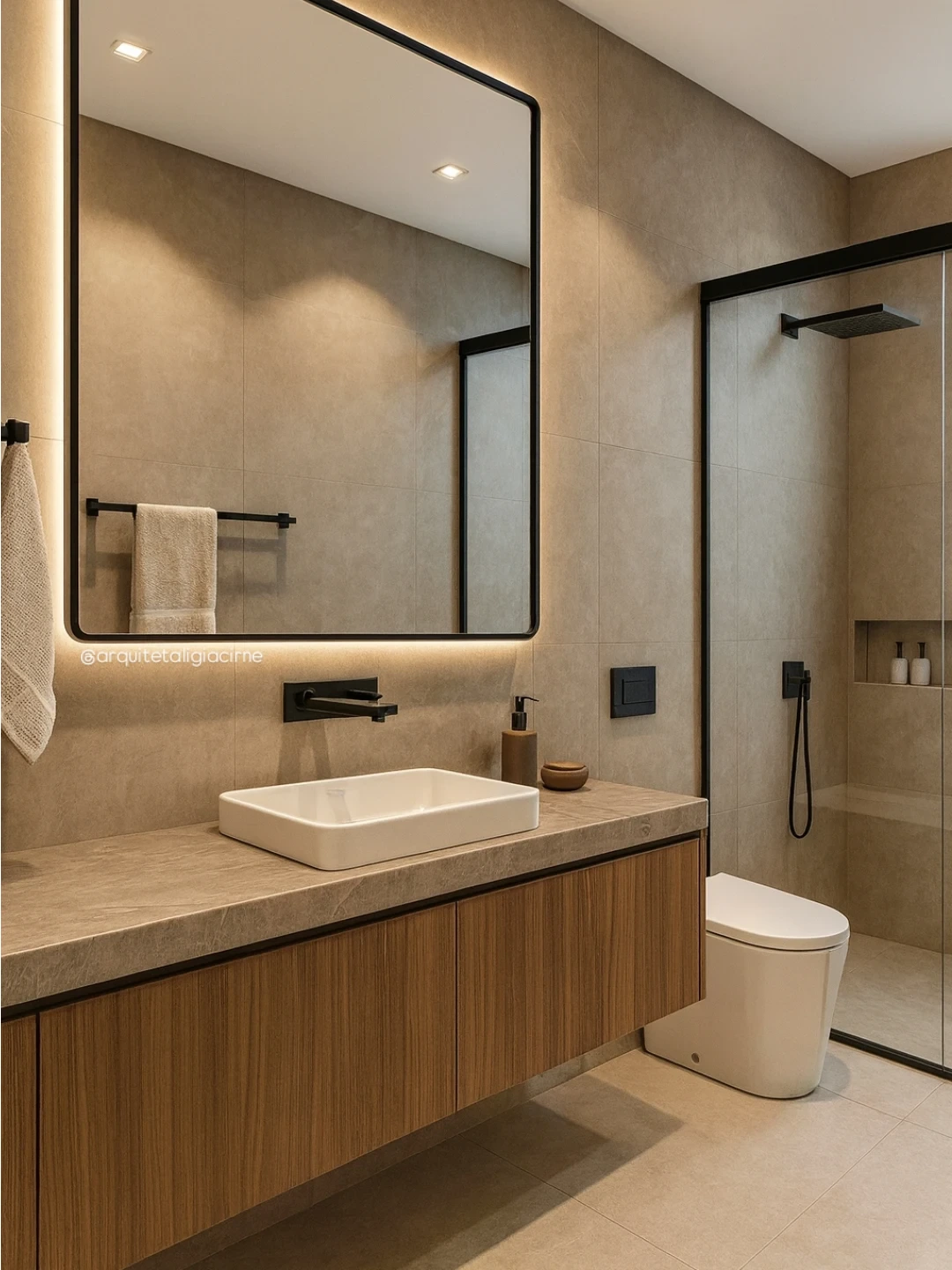 That soft beige palette instantly slows everything down. The floating vanity, clean lines, and subtle lighting under the mirror? Yeah… this is calm luxury done right.
