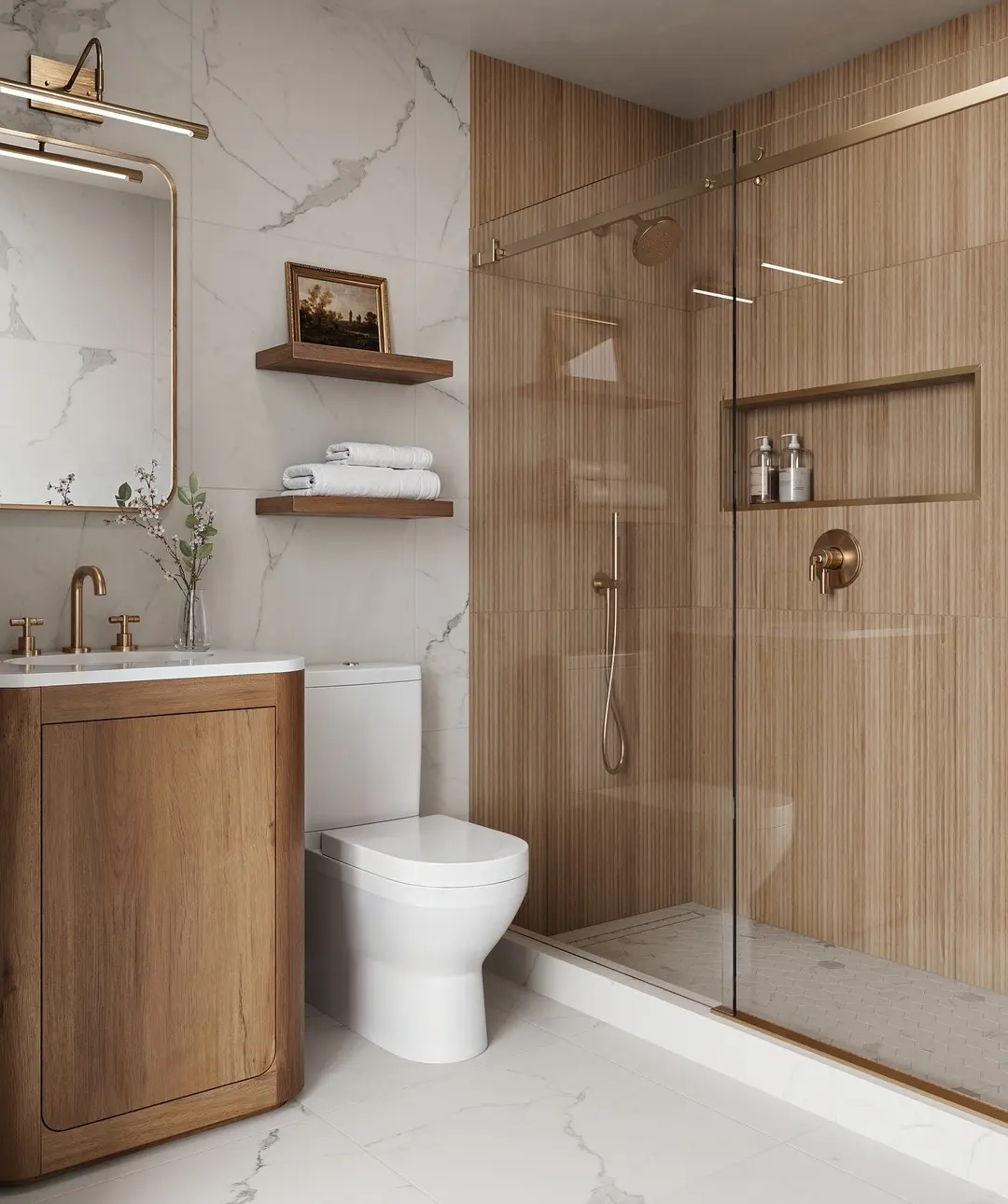 This space is all about balance. Warm wood tones soften the marble, while the black grid shower keeps it modern and structured.