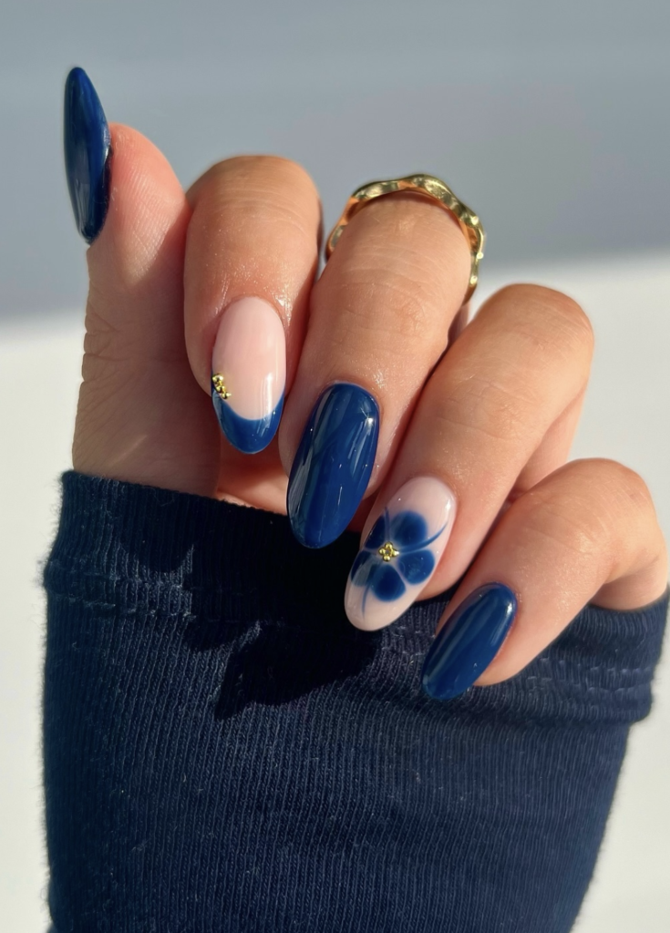 Deep navy meets soft blush in this painterly, wintry mix by @madelineelizabethx. The floral strokes feel almost watercolor-like, adding an artistic softness that stands out against the solid blues. It’s wintery without being cold — more “winter cottage painting” than “icy glam.”