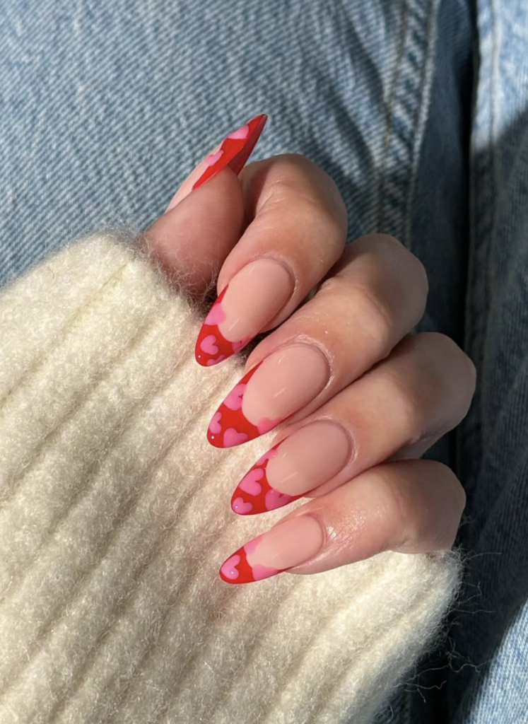 @avrnailswatches brings that playful winter romance energy with these heart-shaped French tips — a bold mix of red and soft pink that feels cozy, flirty, and very “holiday date night.” The hearts melt into the almond shape so naturally, you almost forget how bold the design really is.