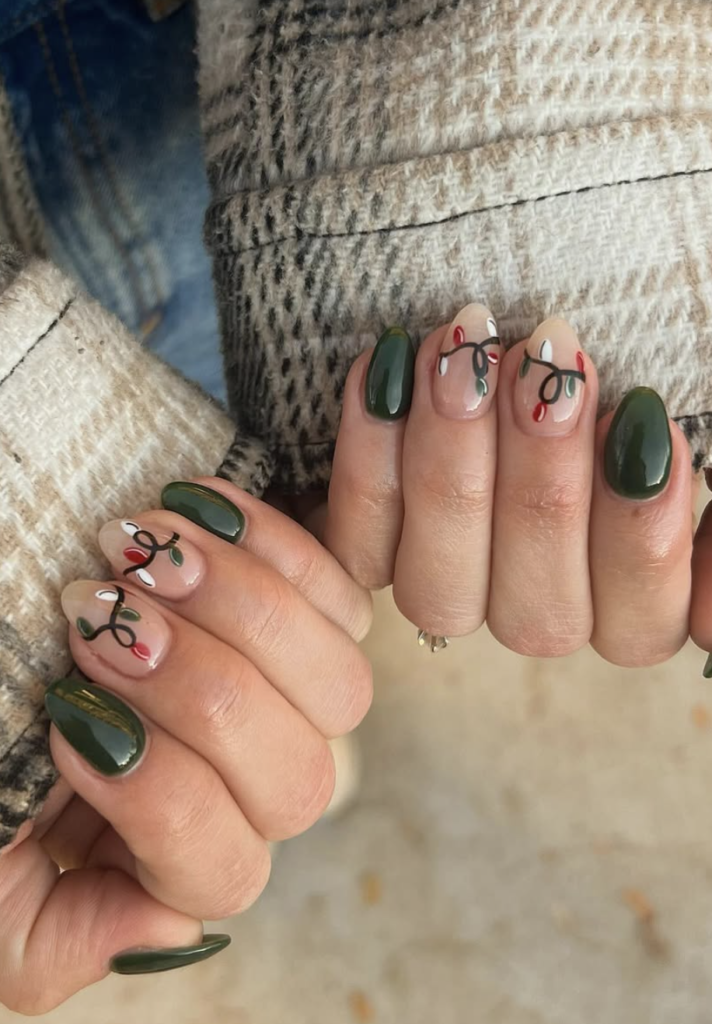 These nails feel like stepping into a holiday market at dusk — warm lights strung across a forest-green backdrop. @nails_by_jenna.k captures that playful, festive moment with adorable light-string details and deep glossy green on the rest of the nails.