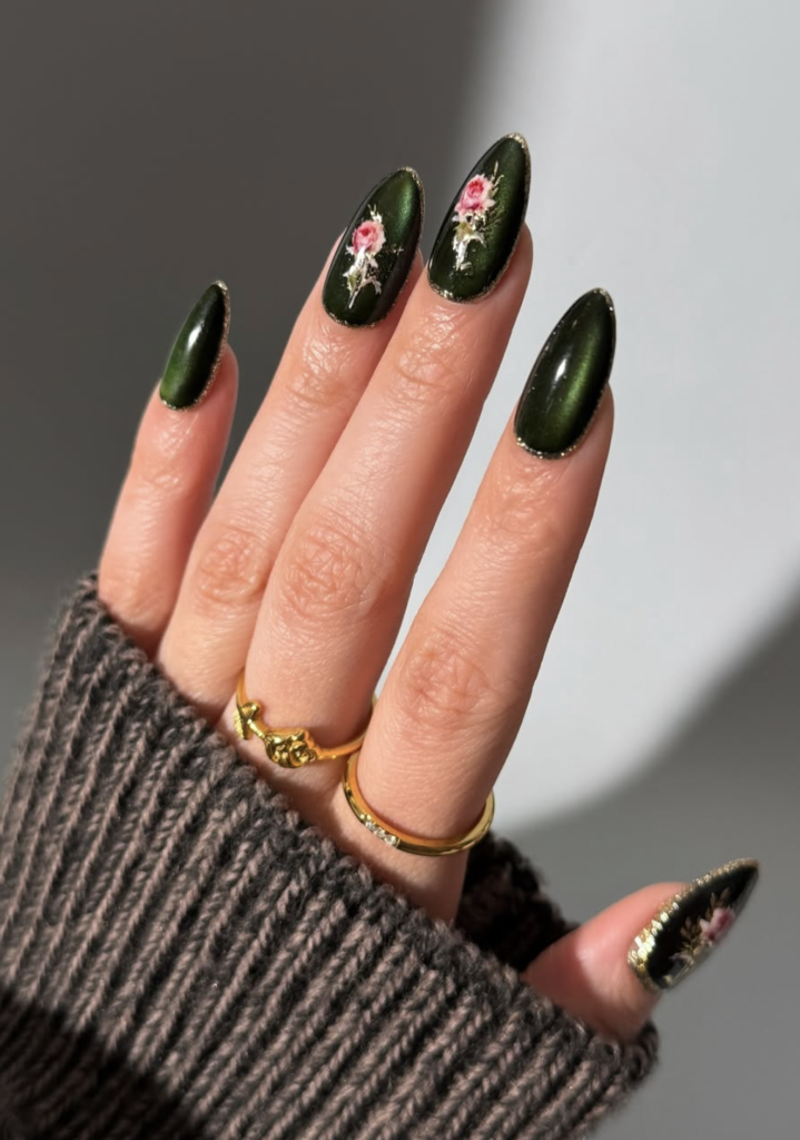 Deep green cat-eye polish already feels rich and wintry, but add delicate hand-painted roses and suddenly it’s giving vintage holiday card vibes. The pink florals pop just enough to feel romantic without overpowering the moody green base.