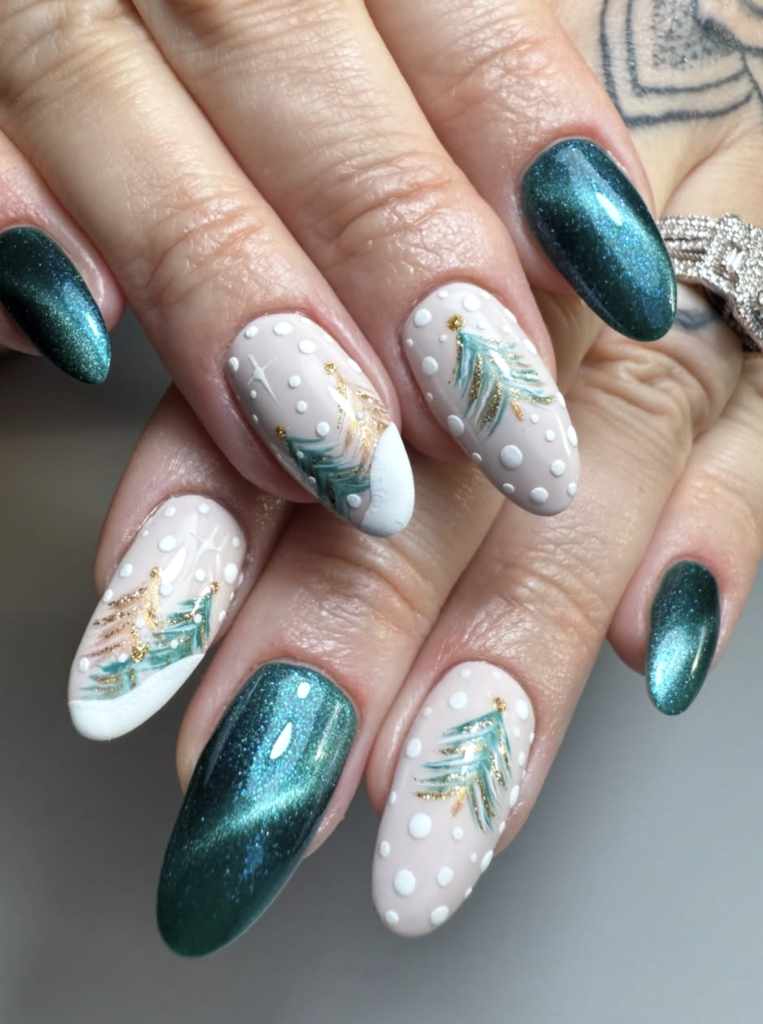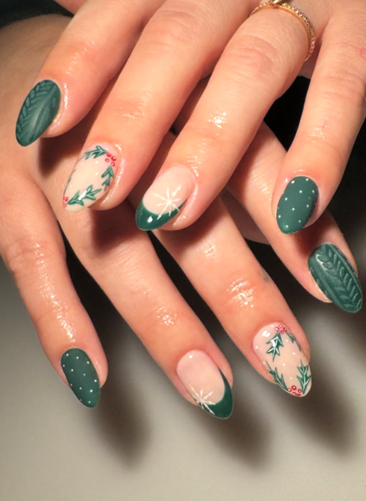 It’s festive without leaning too literal, and the mix of glossy greens with dotted “snowflakes” makes the whole look feel like a calm winter morning. Perfect for anyone who wants seasonal nails that still feel chic and wearable.