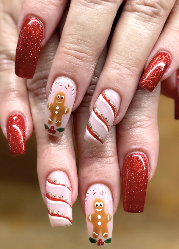 These gingerbread cuties are pure holiday joy — the kind of nails that instantly bring back the smell of cookies baking and peppermint steam rising from a mug. The crisp red glitter, candy-cane swirls, and perfectly iced little gingerbread people feel playful but polished.